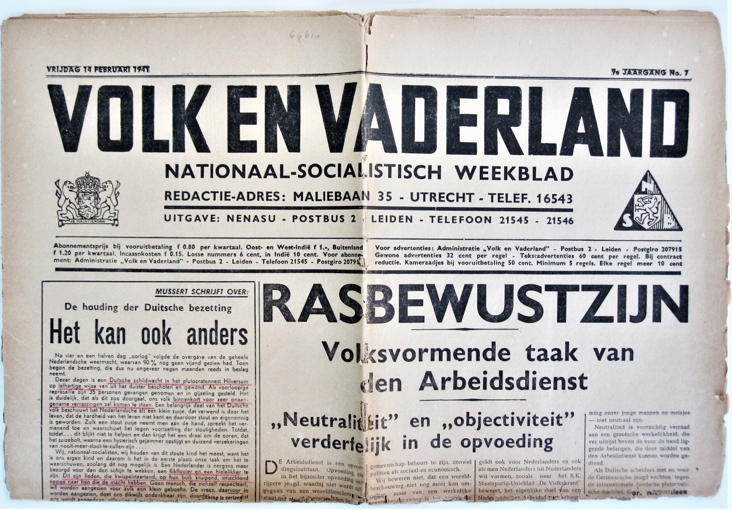 Exemplaar van het Nationaalsocialistisch weekblad ''Volk en Vaderland'' van de N.S.B. Het betreft jaargang 9, nummer 7 van 14 februari 1941.