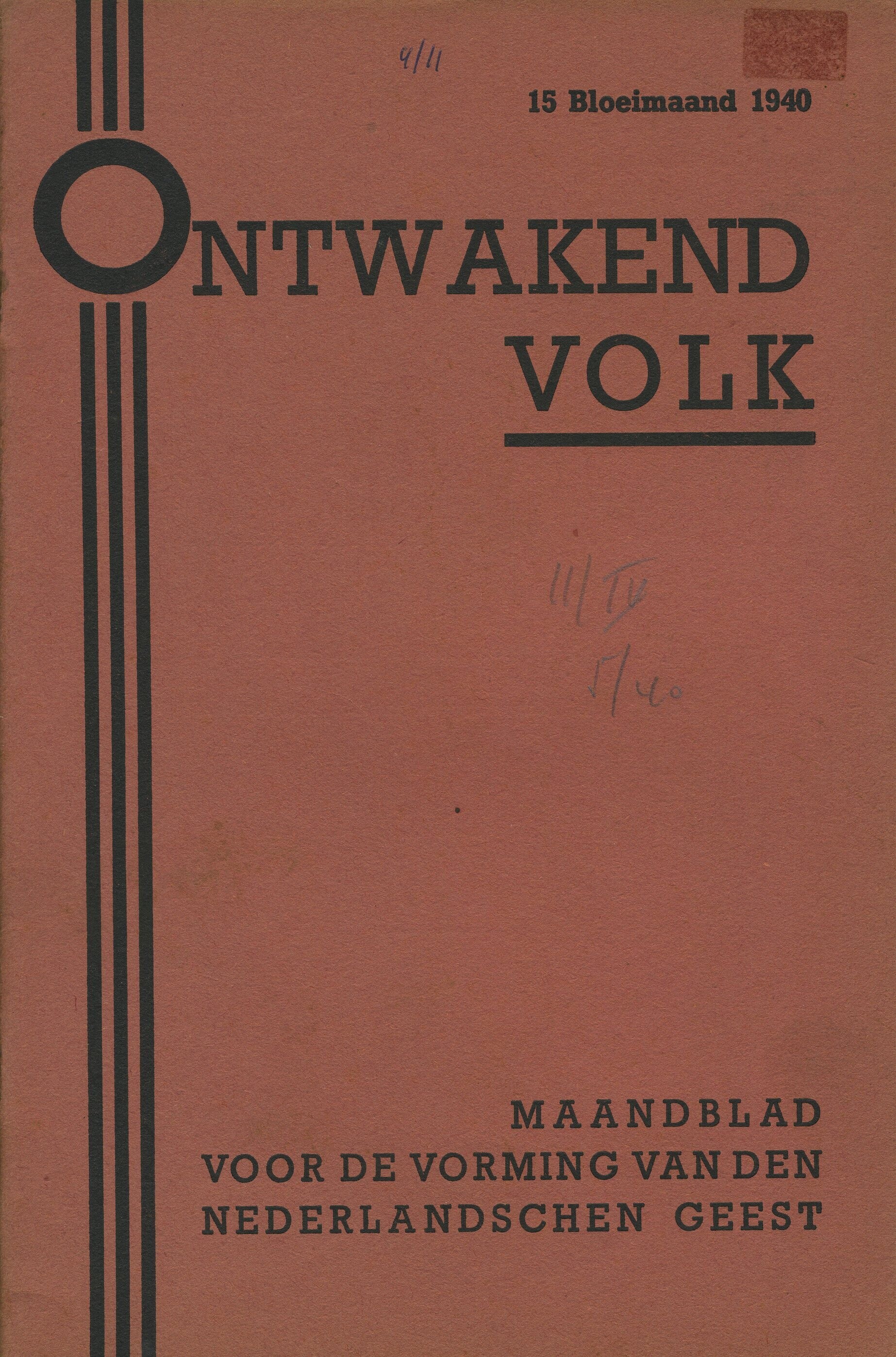 Een exemplaar van ''Ontwakend Volk, maandblad voor de vorming van den Nederlandschen geest'' van de N.S.B. Het betreft de vierde jaargang nummer 11. Bloeimaand 1940 (Mei 1940).