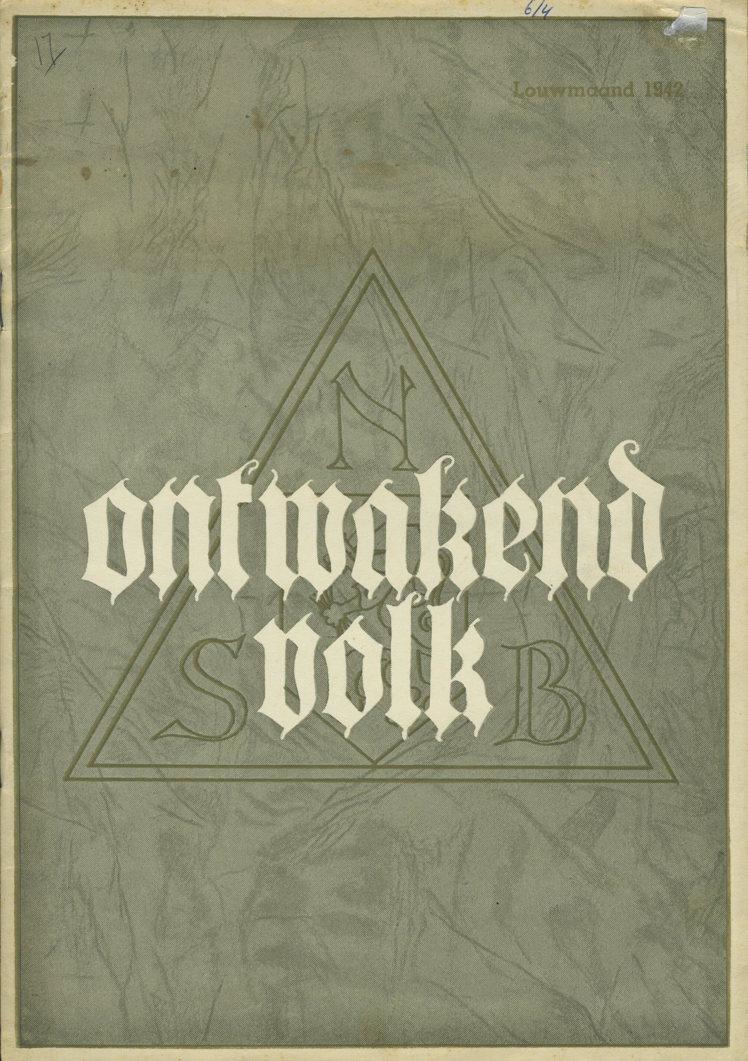 Een exemplaar van ''Ontwakend Volk, maandblad voor de vorming van den Nederlandschen geest'' van de N.S.B. Het betreft de zesde jaargang nummer 4., Louwmaand 1942 (januari 1942).