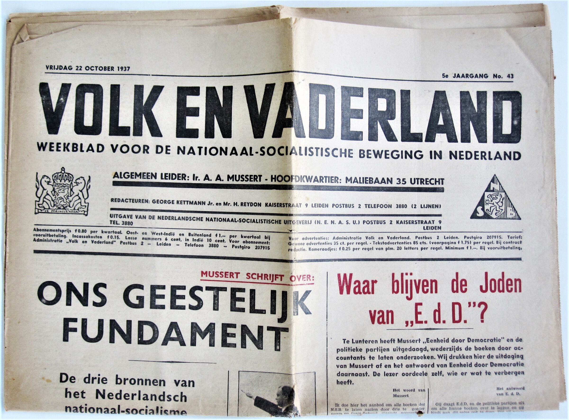 Twee exemplaren van 'Volk en Vaderland', nationaalsocialistisch weekblad van de N.S.B. Het betreft nummer 43 van jaargang 5 van 22 oktober 1937