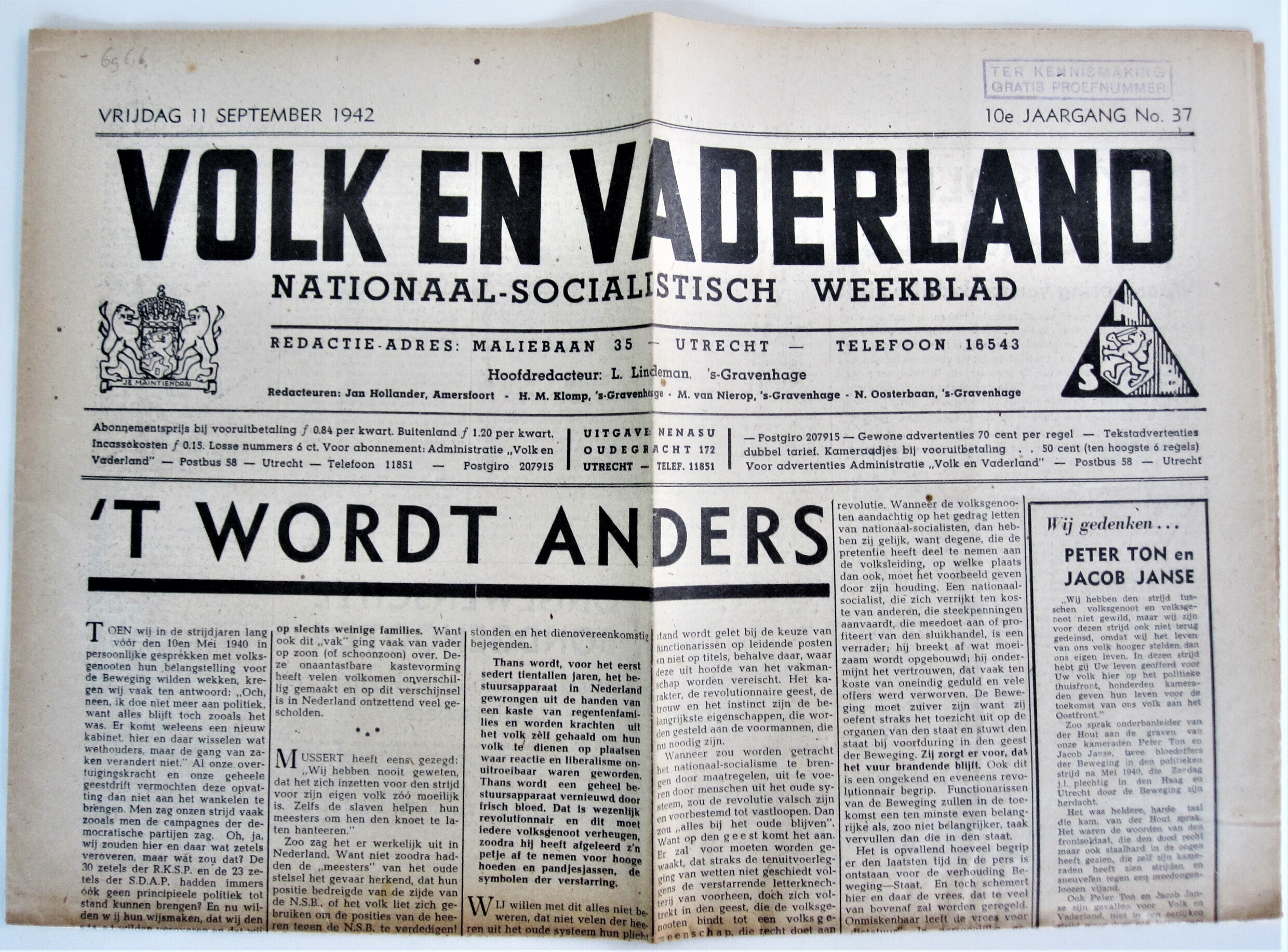 Editie van 'Volk en Vaderland', nationaalsocialistisch weekblad van de N.S.B. Het betreft nummer 37 van jaargang 10 van 11 september 1942.
