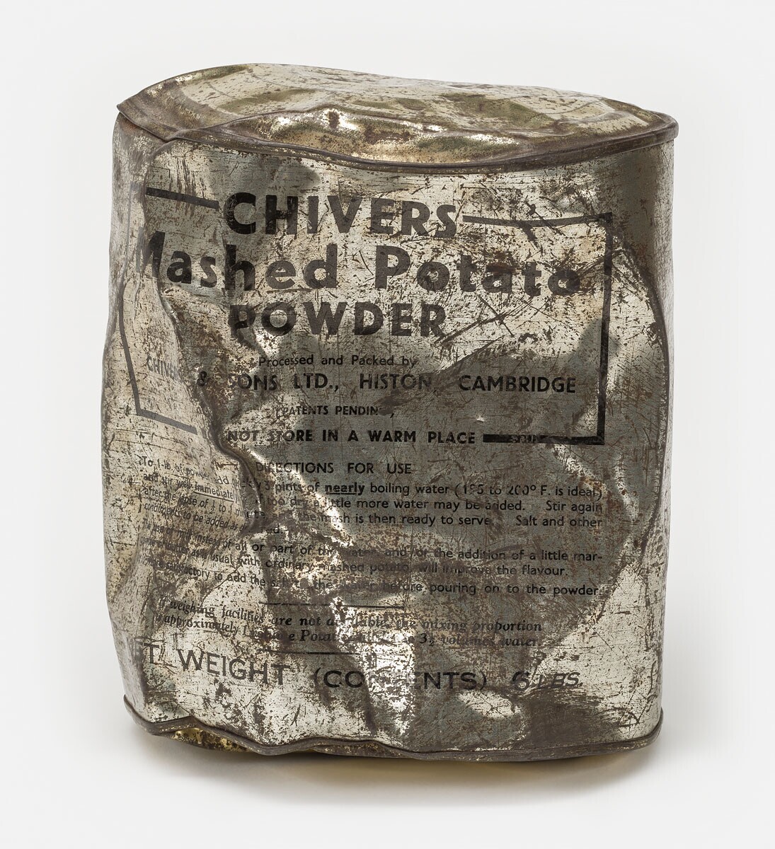 Een zeer ingedeukt maar verder intact blik 'Chivers and Sons Mashed Potato Powder' afkomstig van een voedseldropping in 1945.