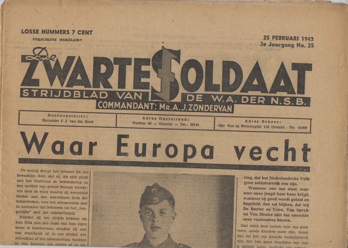 Een editie van ''De zwarte soldaat. Strijdblad van de W.A. der N.S.B.''. Het betreft nummer 25 van de derde jaargang, 25 februari 1943.
