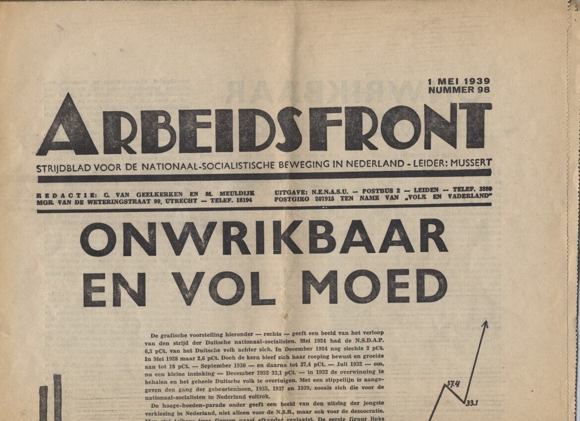 Zeven exemplaren van het tijdschrift "Het Arbeidsfront. Strijdblad voor de Nationaal-Socialistische Beweging in Nederland". Het betreft de nummers 84 (14 oktober 1938), 88 (5 december 1938), 90 (2 januari 1939), 91 (16 januari 1939), 95 (13 maart 1939), 96 (27 maart 1939) en 98 (1 mei 1939).