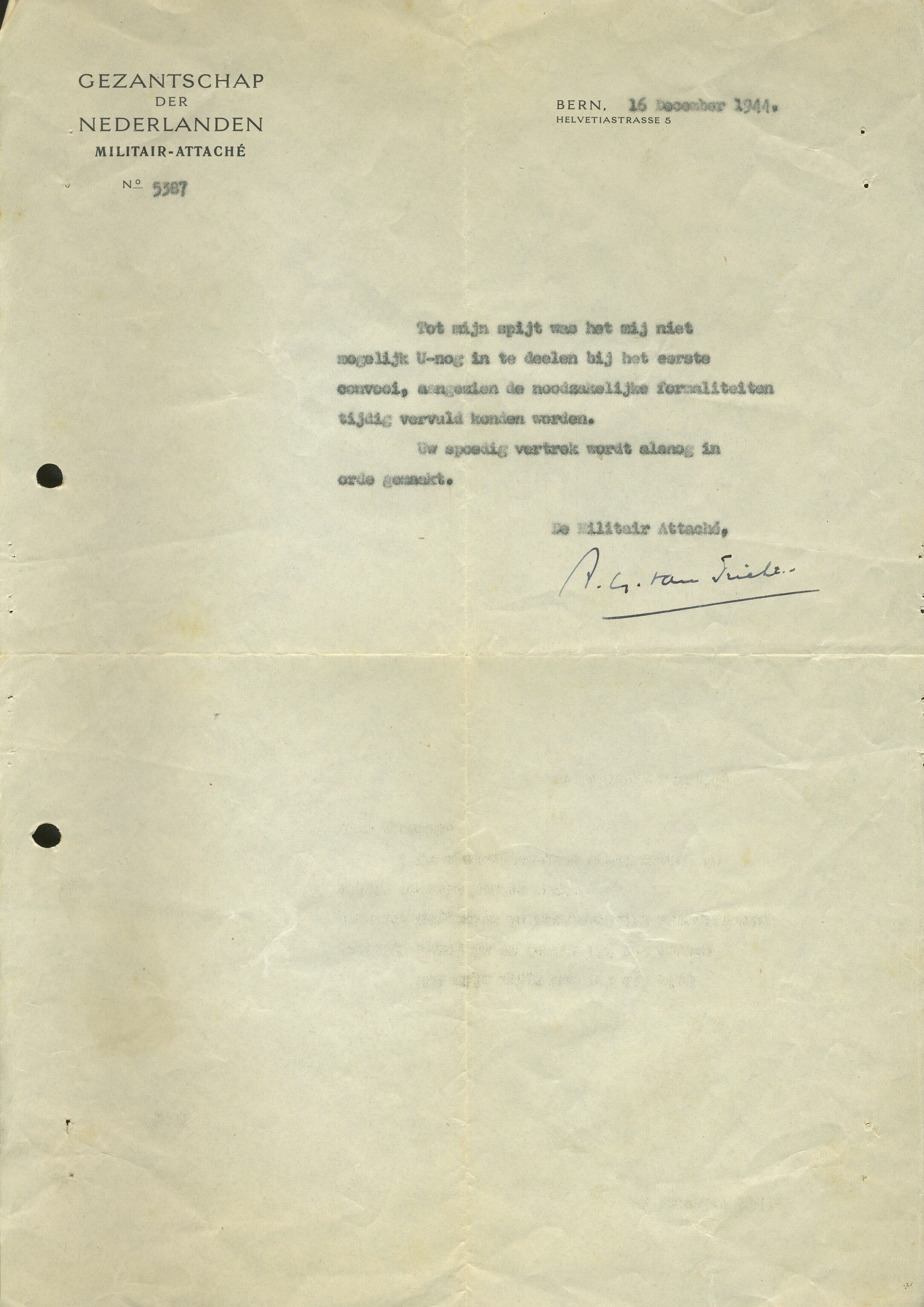Twee brieven en een lijst van het "Gezantschap der Nederlanden" te Bern, Zwitserland aan Cornelis Berkhuijsen. In de brief met datum 16 december 1944 staat dat hij niet is ingedeeld bij het eerste konvooi doordat de noodzakelijke formaliteiten nog niet zijn vervuld. De brief met datum 12 januari 1945 heeft als aanhef "Rondschrijven aan illegale vrijwilligers van het derde Convooi". Het gaat om de repatriëring via het Zwitserse "werkkamp te Les Verrières" in het kanton Neuchâtel en dan via Parijs naar Nederland. In de brief en de bijhorende lijst staan de goederen en levensmiddelen vermeld die men wel en die men niet mag meenemen tijdens de reis.