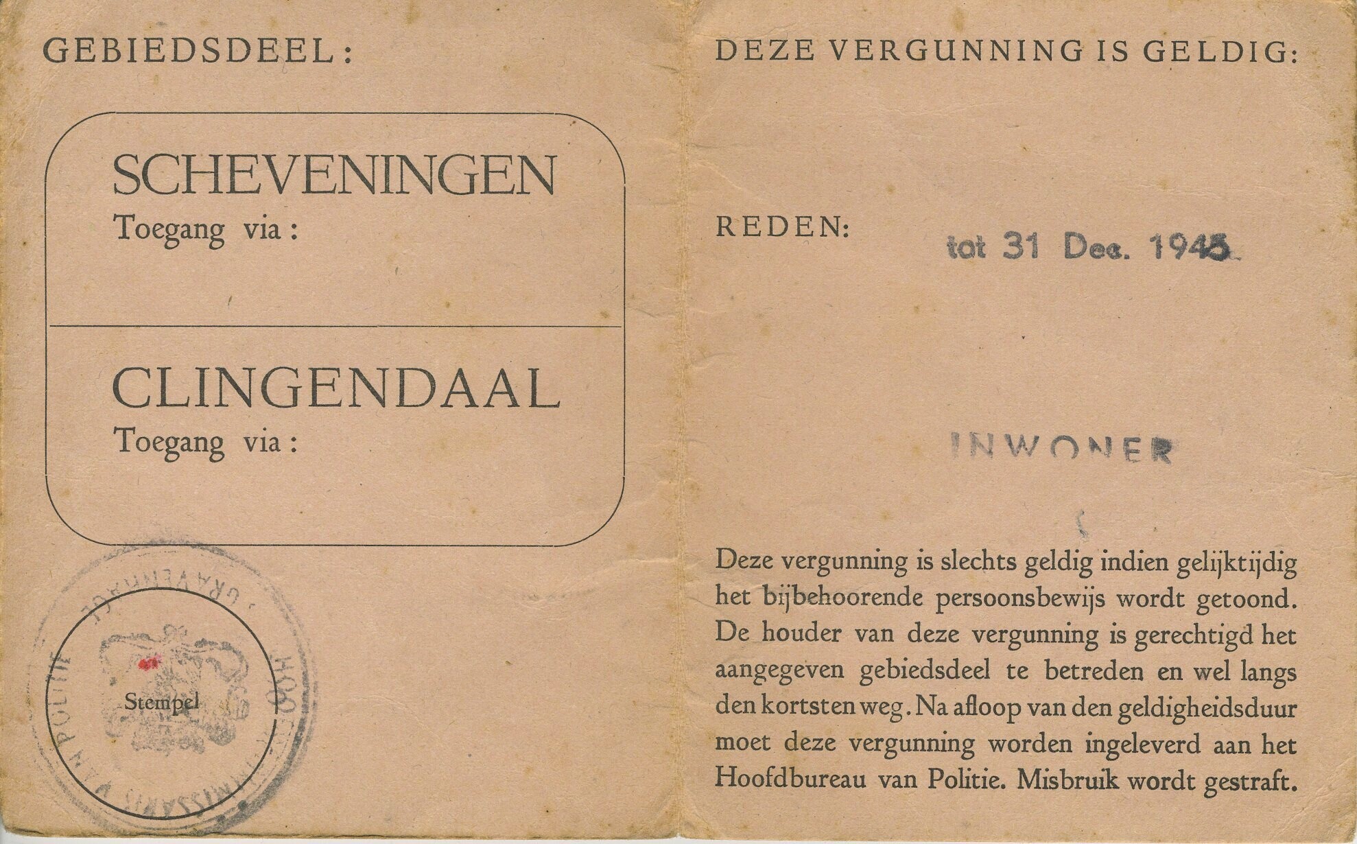 Een vergunning afgegeven op naam van Hendrikje Santman te 's-Gravenhage op 15 oktober 1945, wonende aan de Badhuisstraat 170b "om het vestinggebied te betreden" van Scheveningen en Clingendaal tot 31 december 1945 als inwoner.