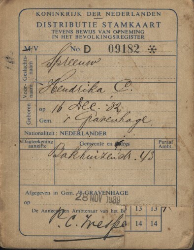 Distributiestamkaart nr. D 09182 op naam van Hendrika C. Spreeuw, geboren 16 december 1932, afgegeven door de gemeente Den Haag.