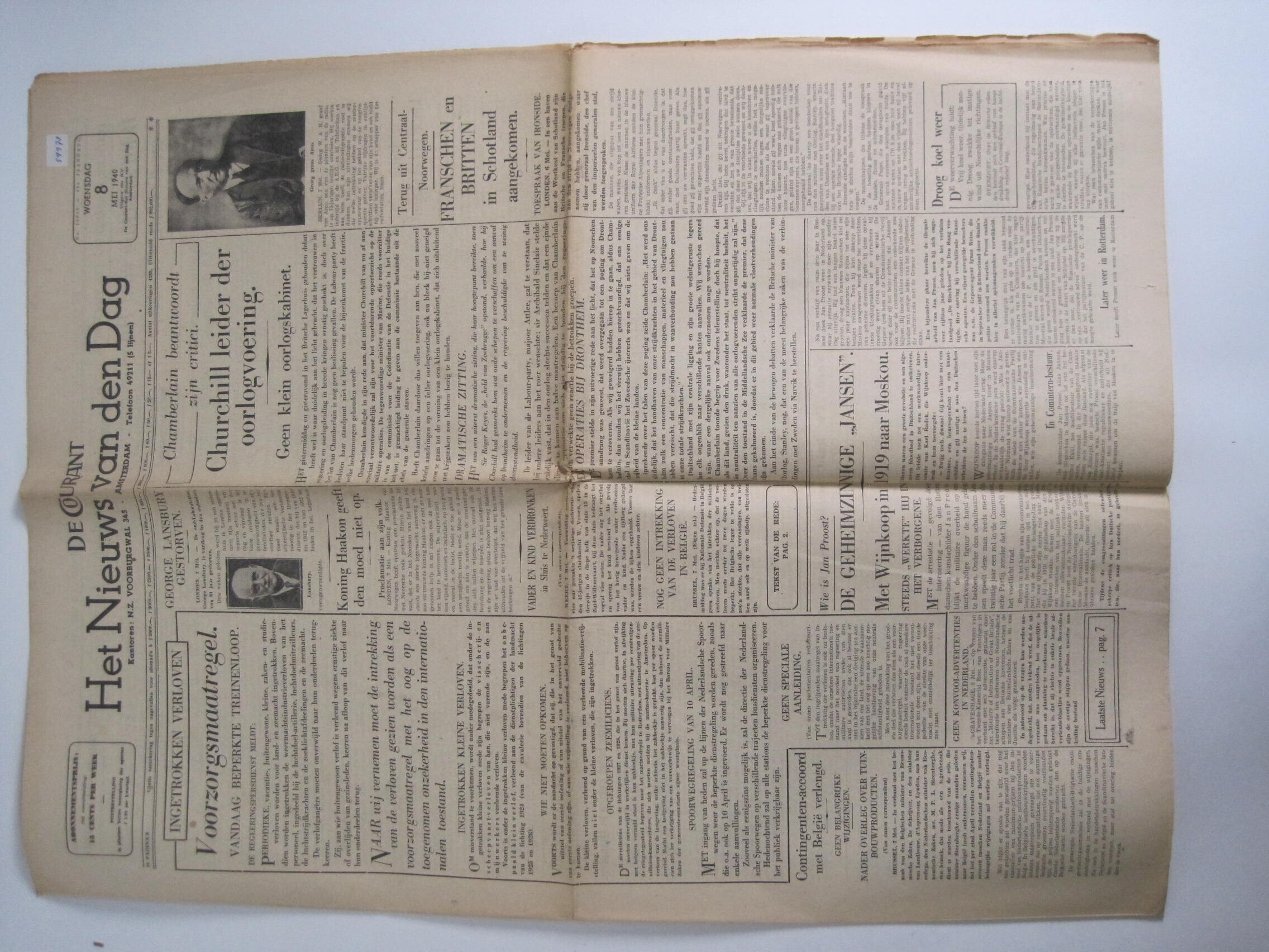 "De Courant - Het Nieuws van den Dag" 8 mei 1940<br>(o.a. "ingetrokken verloven" en "Churchill in Engeland, leider der oorlogvoering".<br>