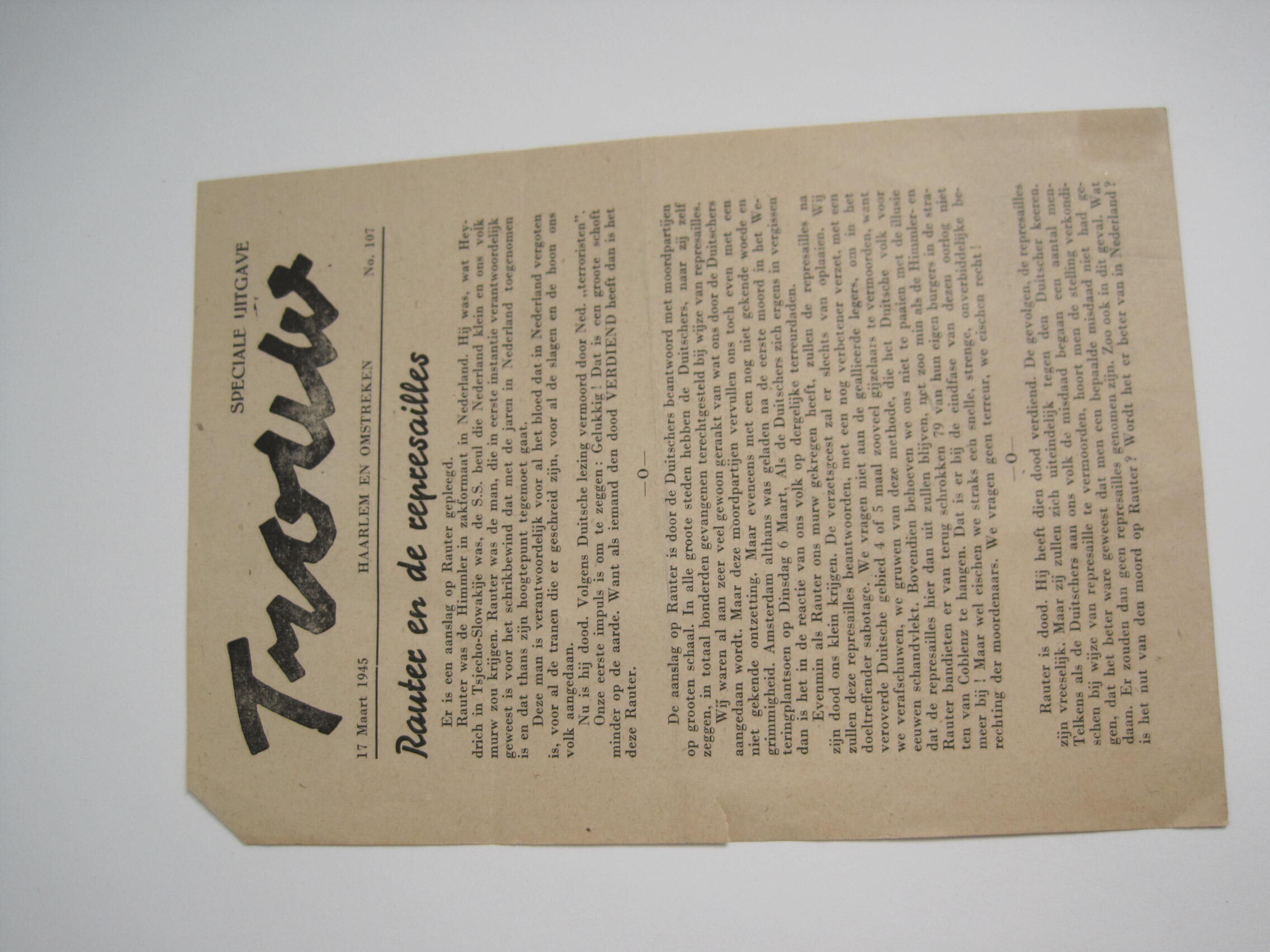 Nieuwsbulletin Trouw, speciale uitgave voor Haarlem en omstreken. 3 stuks, gestencild en gedrukt. no. 106 17 maart 1945 no. 107 17 maart 1945 no. 110 20 maart 1945