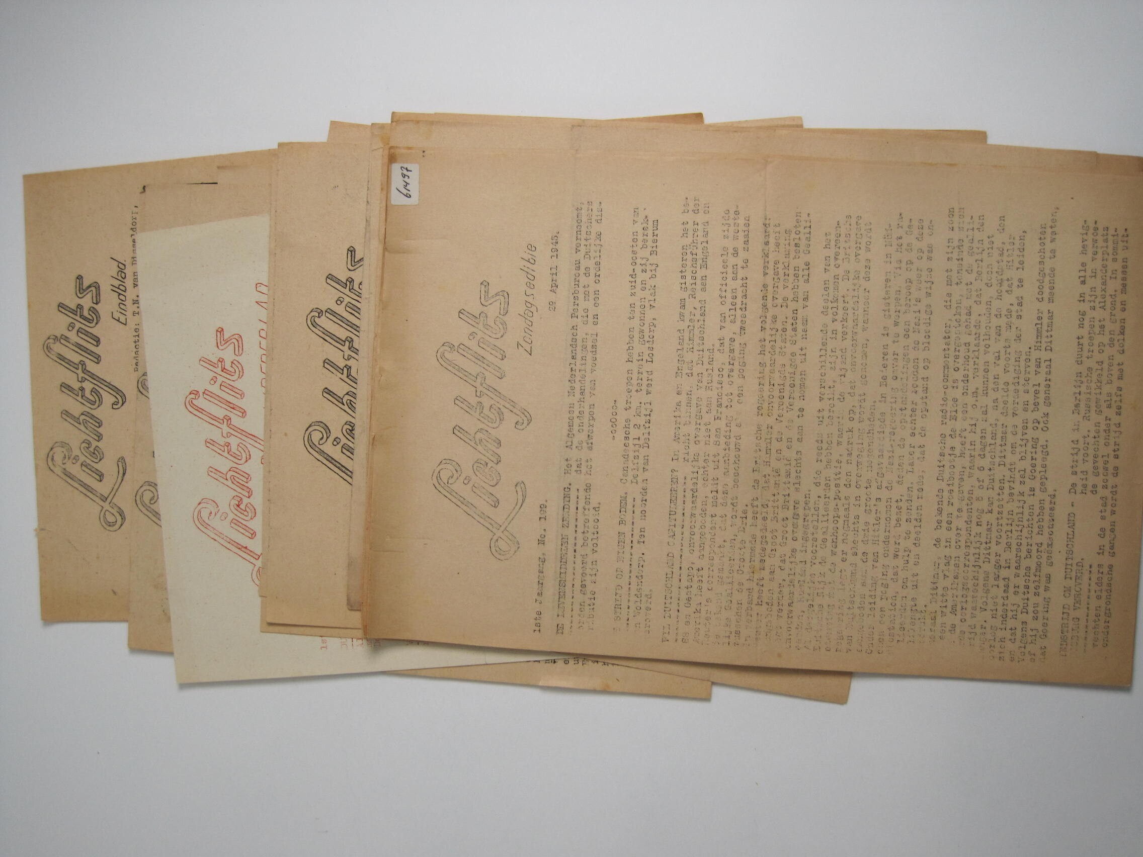 Vijftien exemplaren van het op op stencilpapier uitgegevenn ieuwsbulletin 'Lichtflits'.<br>