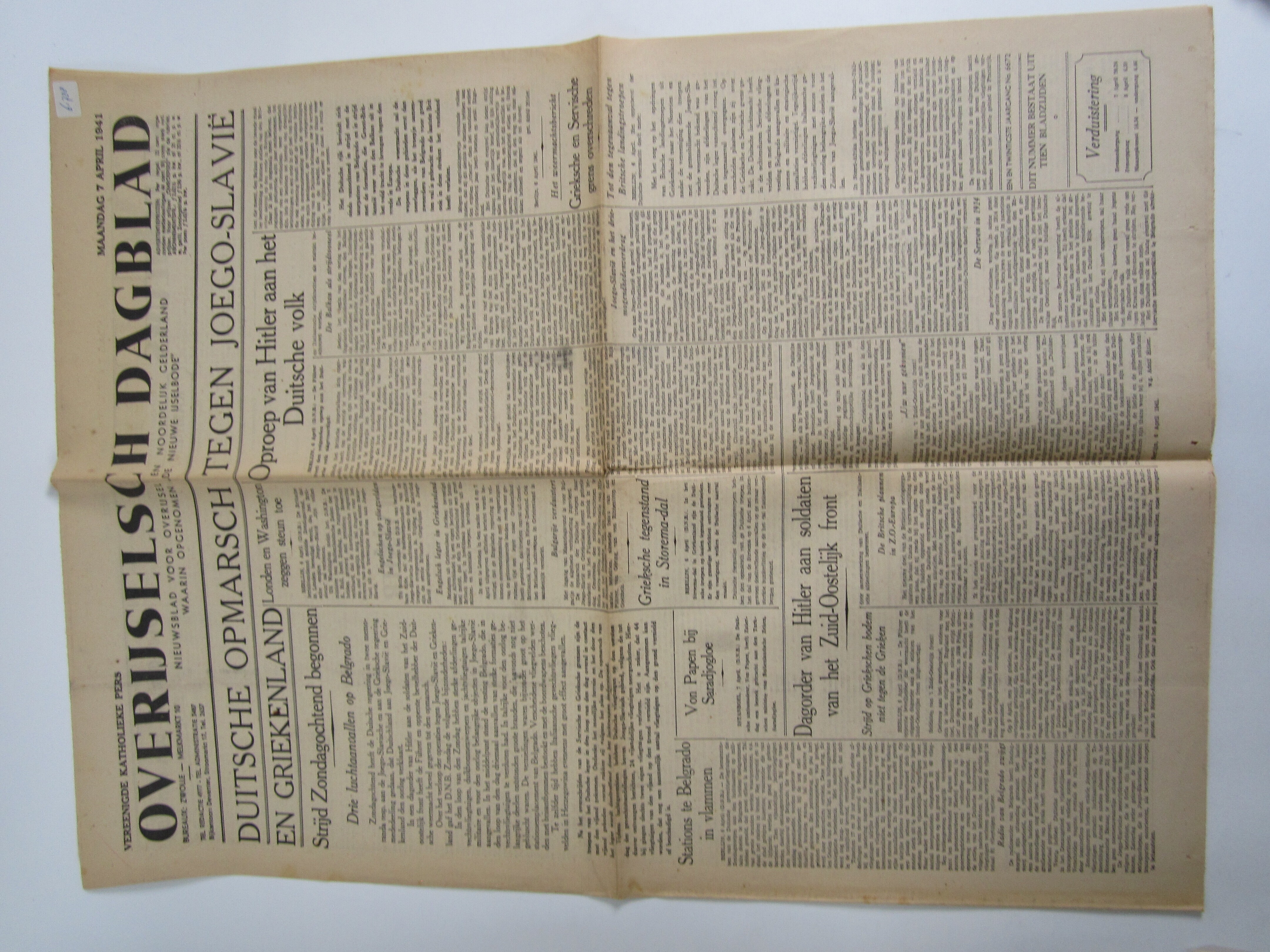 "Overijselsch Dagblad, Nieuwsblad voor Overijsel en noordelijk Gelderland" van 7 april 1941.<br>"Duitsche opmars tegen Joego-Slavië en Griekenland".<br>