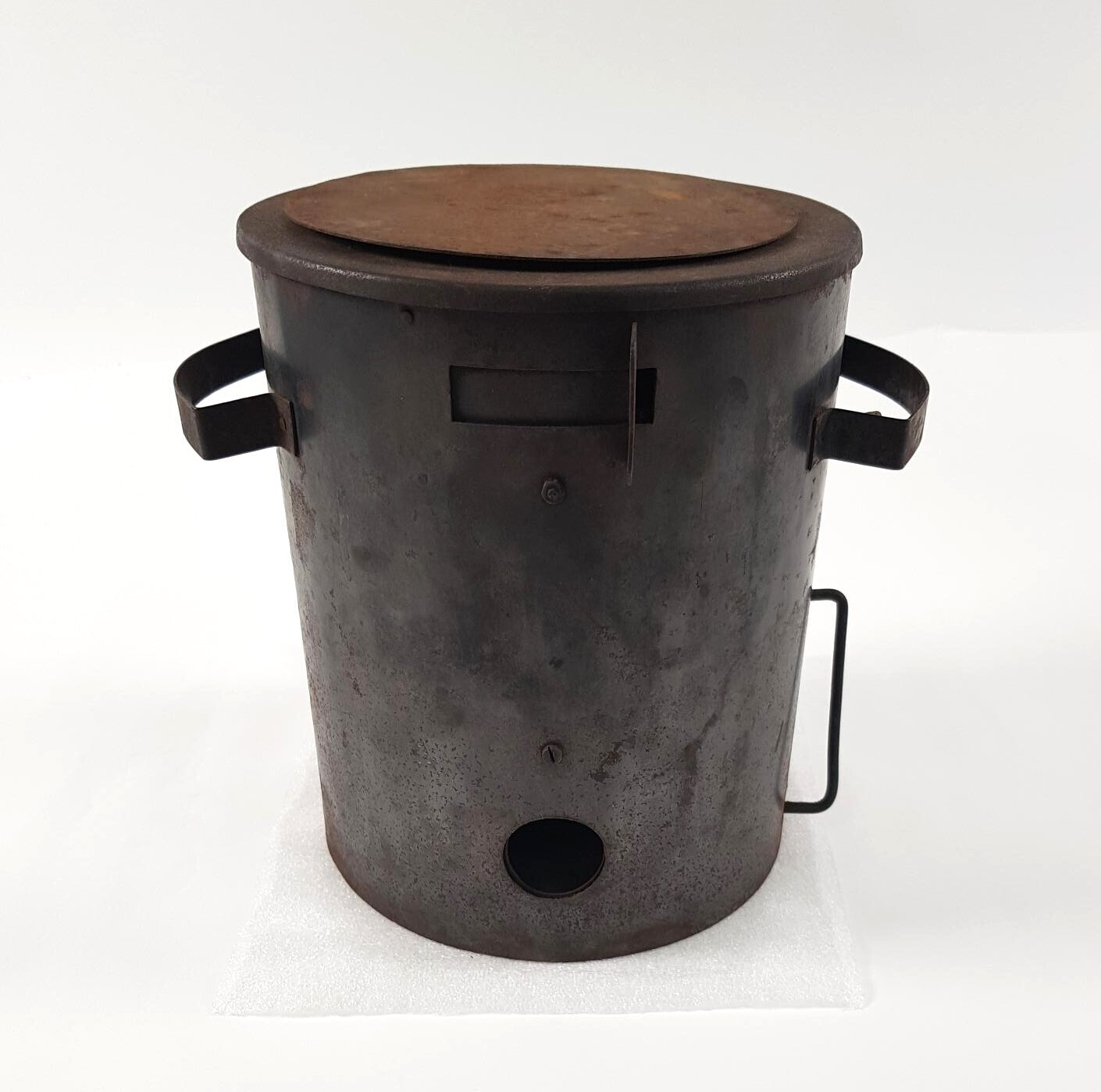 Een noodkacheltje (MAJO) van zwart ijzer dat in de Tweede Wereldoorlog werd gebruikt om op te koken.