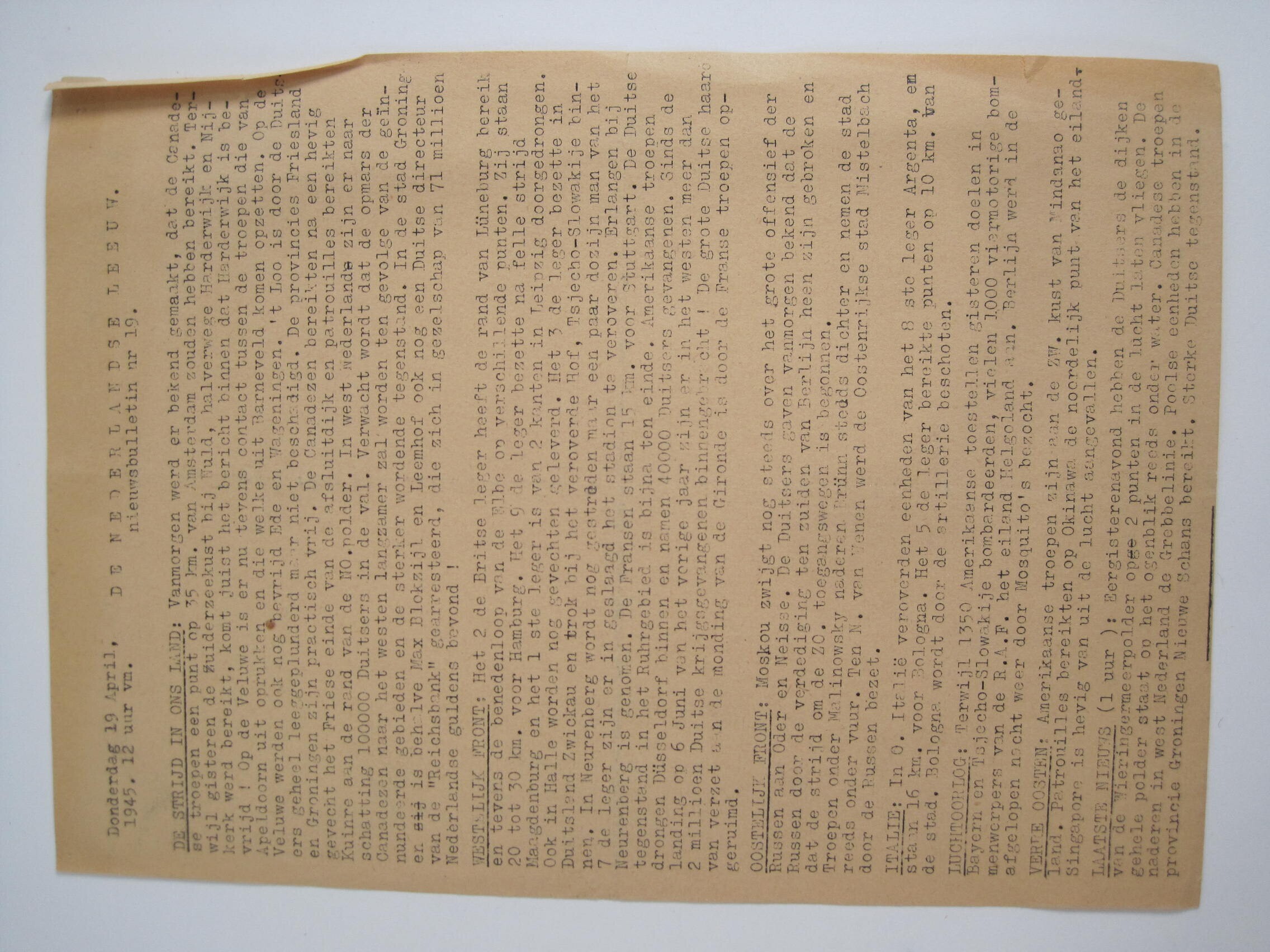 Illegaal Nieuwsbulletin "De Nederlandse Leeuw" , no. 19.<br>9 april 1945 (12 uur v-m)<br>