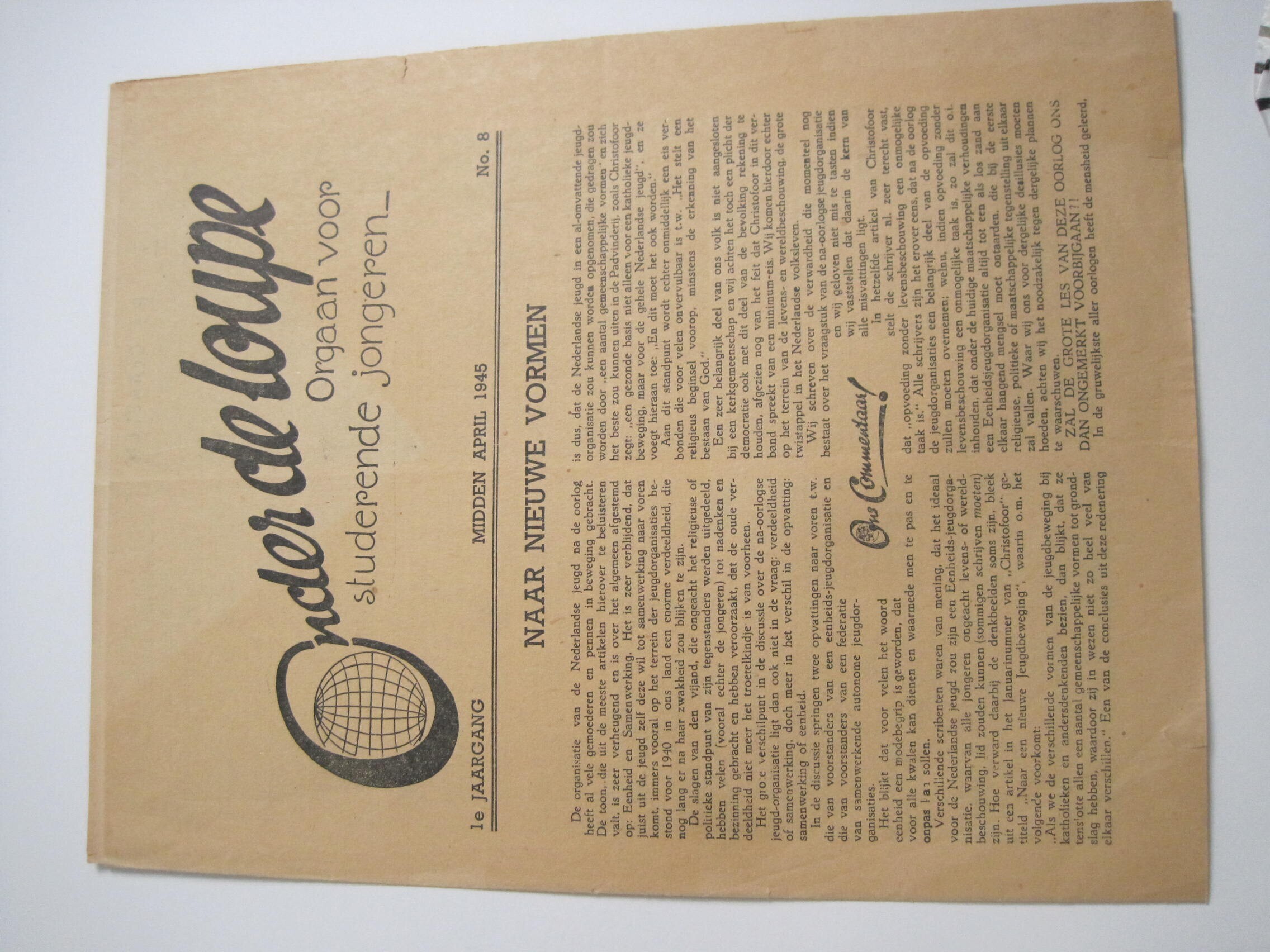 Illegaal blad "Onder de Loupe", orgaan voor studerende jongeren.<br>1e jaargang no. 8 (midden april 1945)<br>o.a. artikelen over Indonesië, toenadering tot Duitse jeugd en de machtsovername van Hitler.