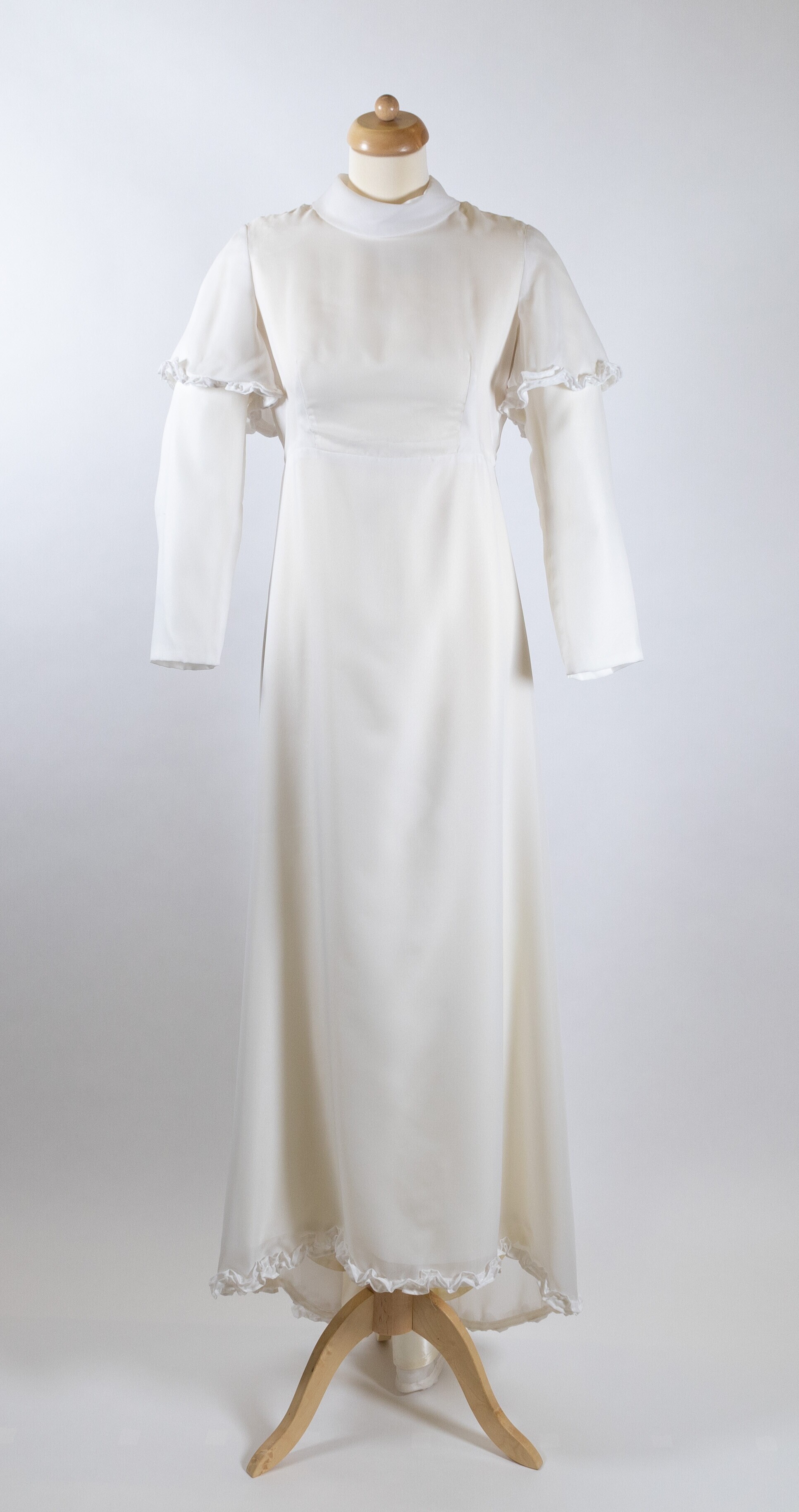 Trouwjurk gemaakt uit katoensatijn en chiffon. De jurk is omstreeks 1943 gemaakt door mevr. Elisabeth van der Burgh voor haar verwachtte huwelijk met een Duitse militair. Het huwelijk vond nooit plaats.