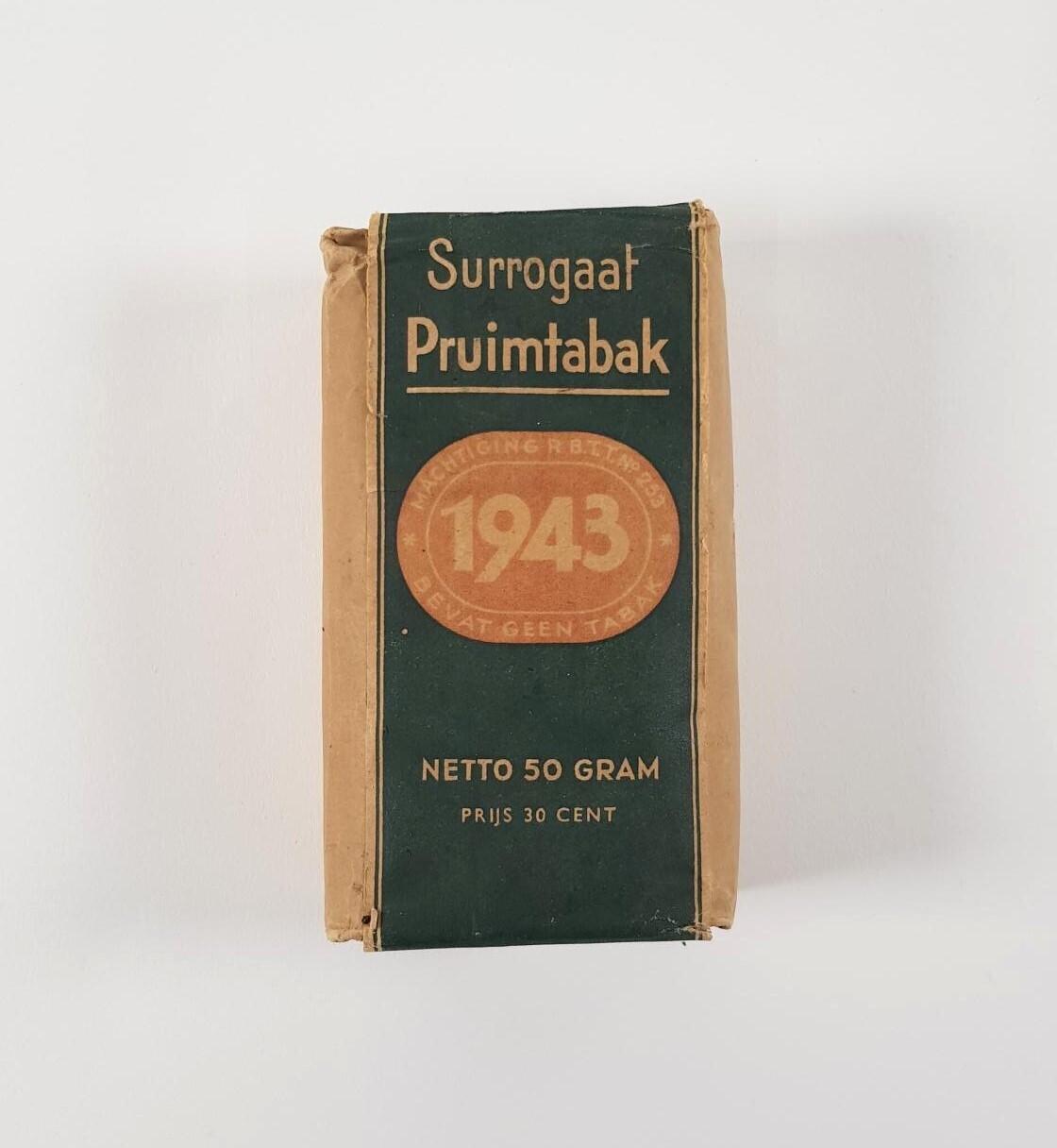 Een verpakking (mét inhoud) van surrogaat pruimtabak. Producten als koffie, tabak en thee waren gedurende de Tweede Wereldoorlog moeilijk te verkrijgen. Veel van deze schaarse producten werden dan ook vervangen door surrogaten.