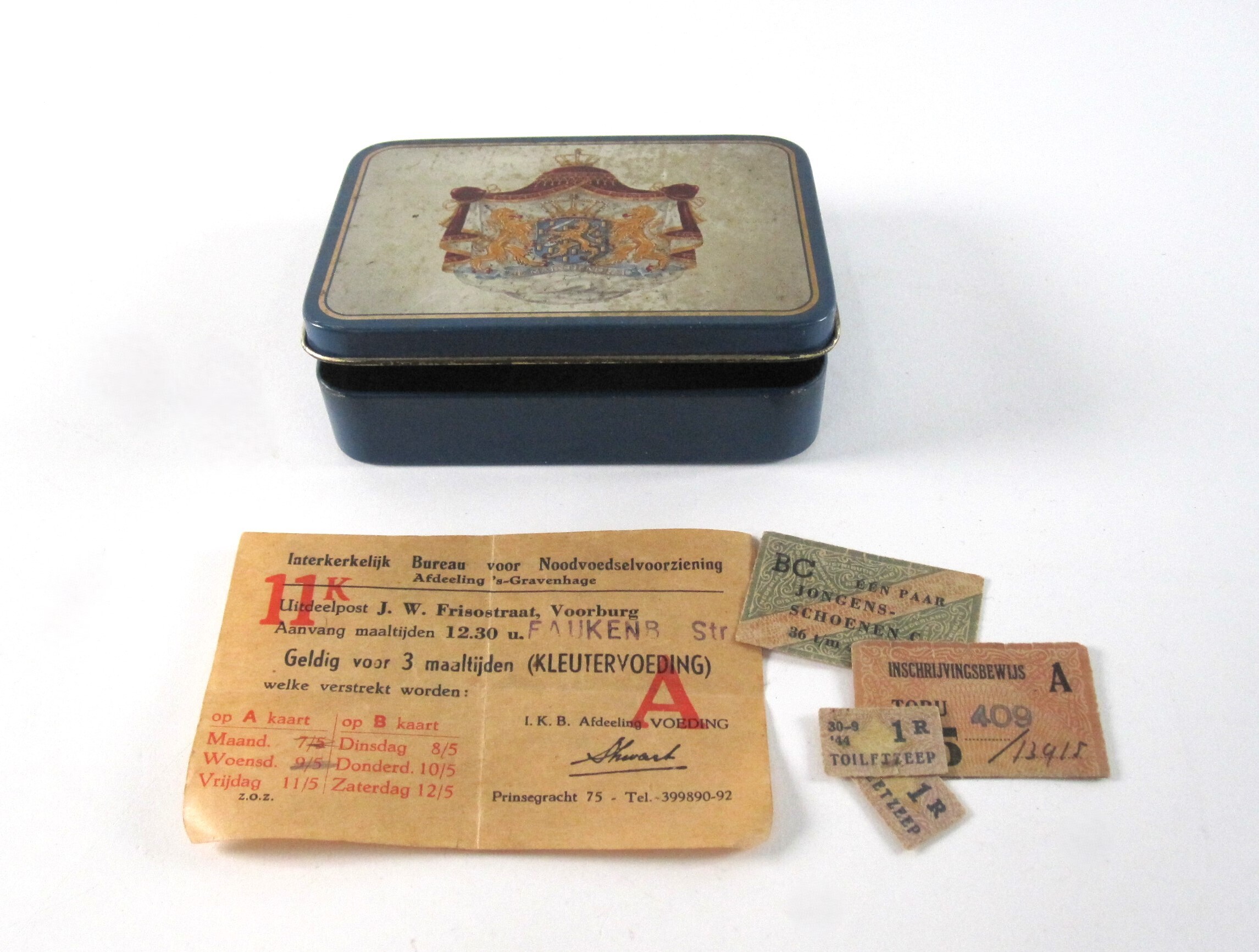 Een metalen blik met daarin verschillende distributiebonnen. Op de bovenzijde van het blik staat het wapen van Oranje-Nassau op een witte achtergrond. Aan de binnenzijde van het blik: een advertentie voor sigarettenpapier van het merk Rizla. In het blik verschillende distributiebonnen voor: kleutervoeding, jongensschoenen en toiletzeep evenals een inschrijvingsbewijs TOBU.