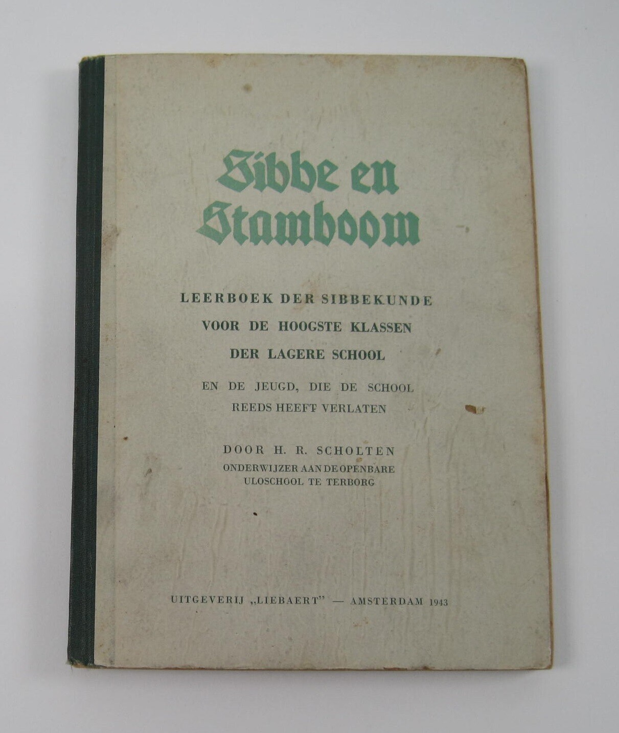 Lesboek "Sibbe en stamboom, leerboek der sibbekunde voor de hoogste klassen der lagere school en de jeugde die de school reeds heeft verlaten" over genealogie en het belang ervan.