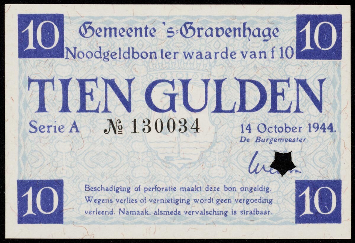 Verzameling van 159 tien gulden noodgeldbonnen, uitgegeven door de gemeente Den Haag op 14 oktober 1944. Op de voorzijde in blauw de tekst: "Gemeente ‘s-Gravenhage, noodgeldbon ter waarde van tien gulden. Op de achterzijde het gemeentewapen en informatie over het inwisselen van de bon. De noodgeldbon was inwisselbaar tegen een wettig betaalmiddel bij de Gemeenteontvanger of een nader aan te wijzen bankinstelling. Een deel van de bonnen is met een label bijeengebonden. Op het ronde metalen label staat met de hand geschreven: "50 stuks niet uitgegeven geldbonnen a 10,- 's-Gravenhage".