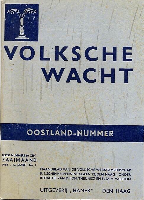 Jaargang 7 (1942) nummer 7 van het tijdschrift Volksche Wacht. Dit maandblad werd vanaf 1939 door de N.S.B. uitgegeven. Het laatste nummer verscheen in 1944. Aanvankelijk werd het blad uitgegeven onder de namen De Wolfsangel en Der Vaderen Erfdeel. Het blad behandelde onderwerpen op het gebied van volkse cultuur, volkskunde, heemkunde, rassenkunde, erfgezondheid, bevolkingspolitiek en sibbekunde.<br>Deze uitgave is getiteld: Oostland-nummer.
