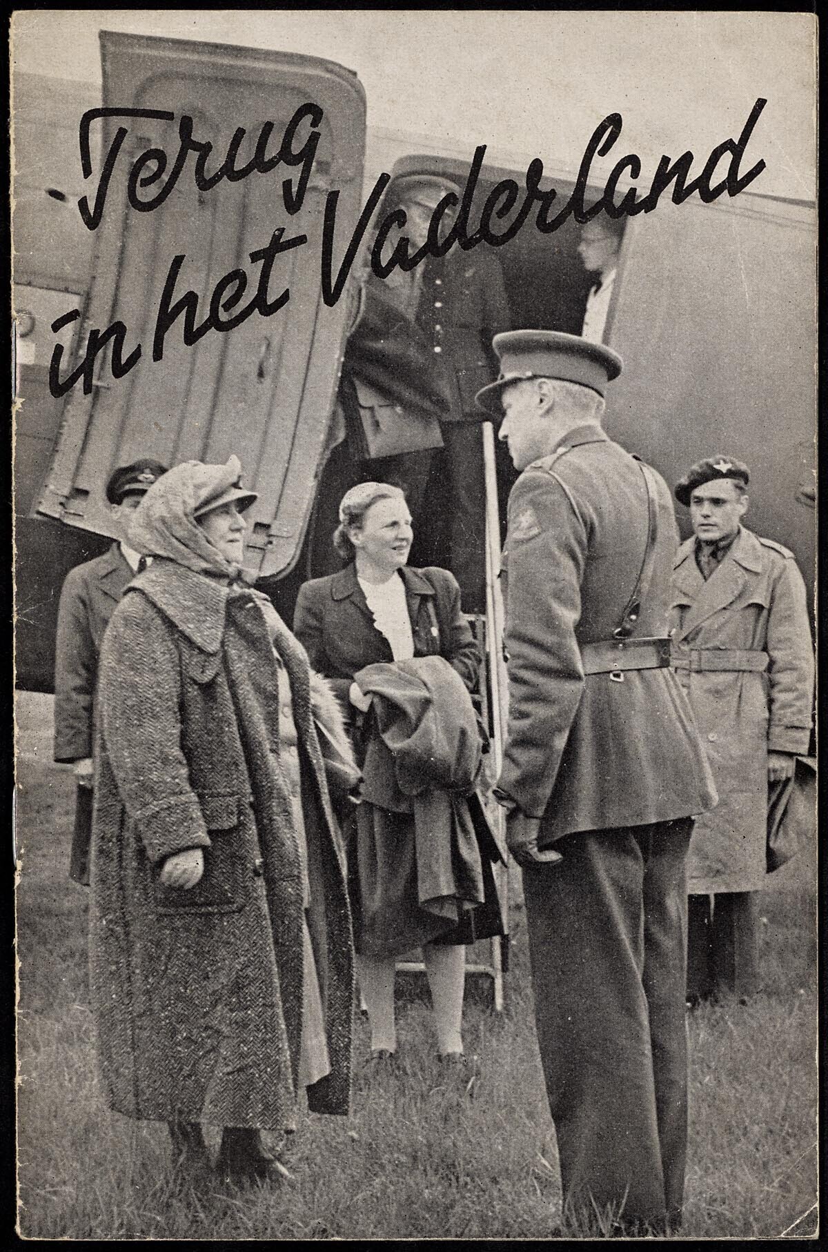 Een boekje met zwartwit foto's van de aankomst in Nederland van de koninklijke familie na de oorlog.