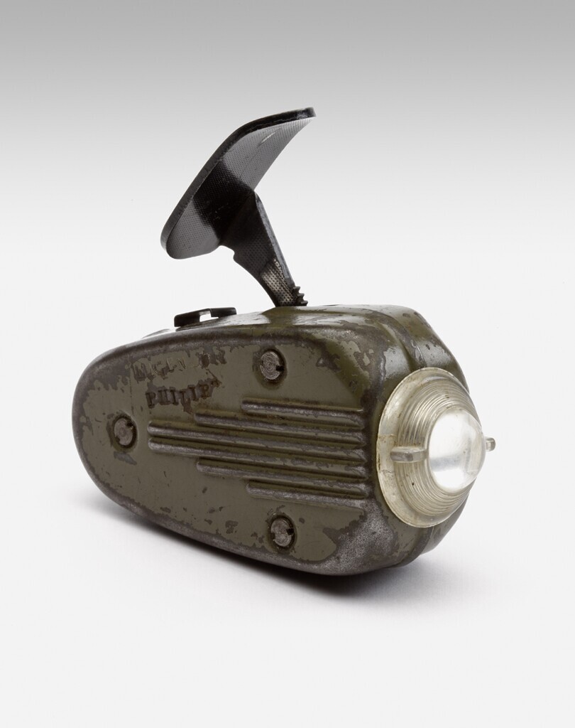 Een knijpkat: type 7424-03. 2,5V 0,1A. Op deze handgenerator met lampje staat het logo van de fabrikant Philips en op de zijkant de tekst: "Made in Holland" en "Importe de Hollande". Op de bovenkant staat de tekst: "Eigendom Philips".