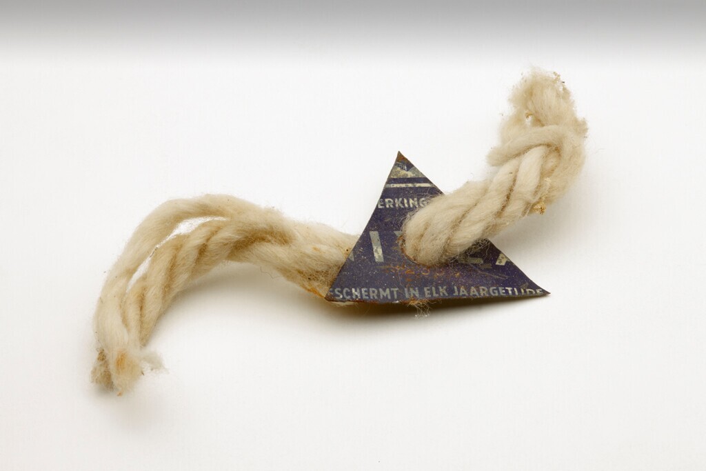 Zelfgemaakt nachtlicht uit een driehoekig stukje blik met in het midden een rond gat waardoor een lontje is gestoken.