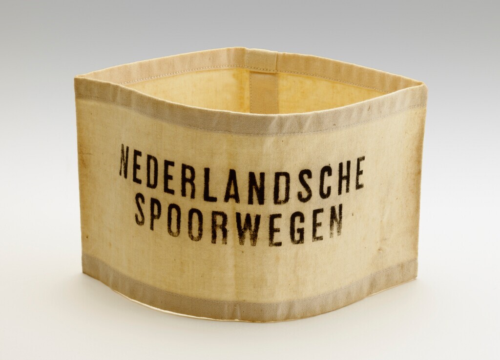 Een wit katoenen mouwband met in zwarte opdruk: "Nederlandsche Spoorwegen".