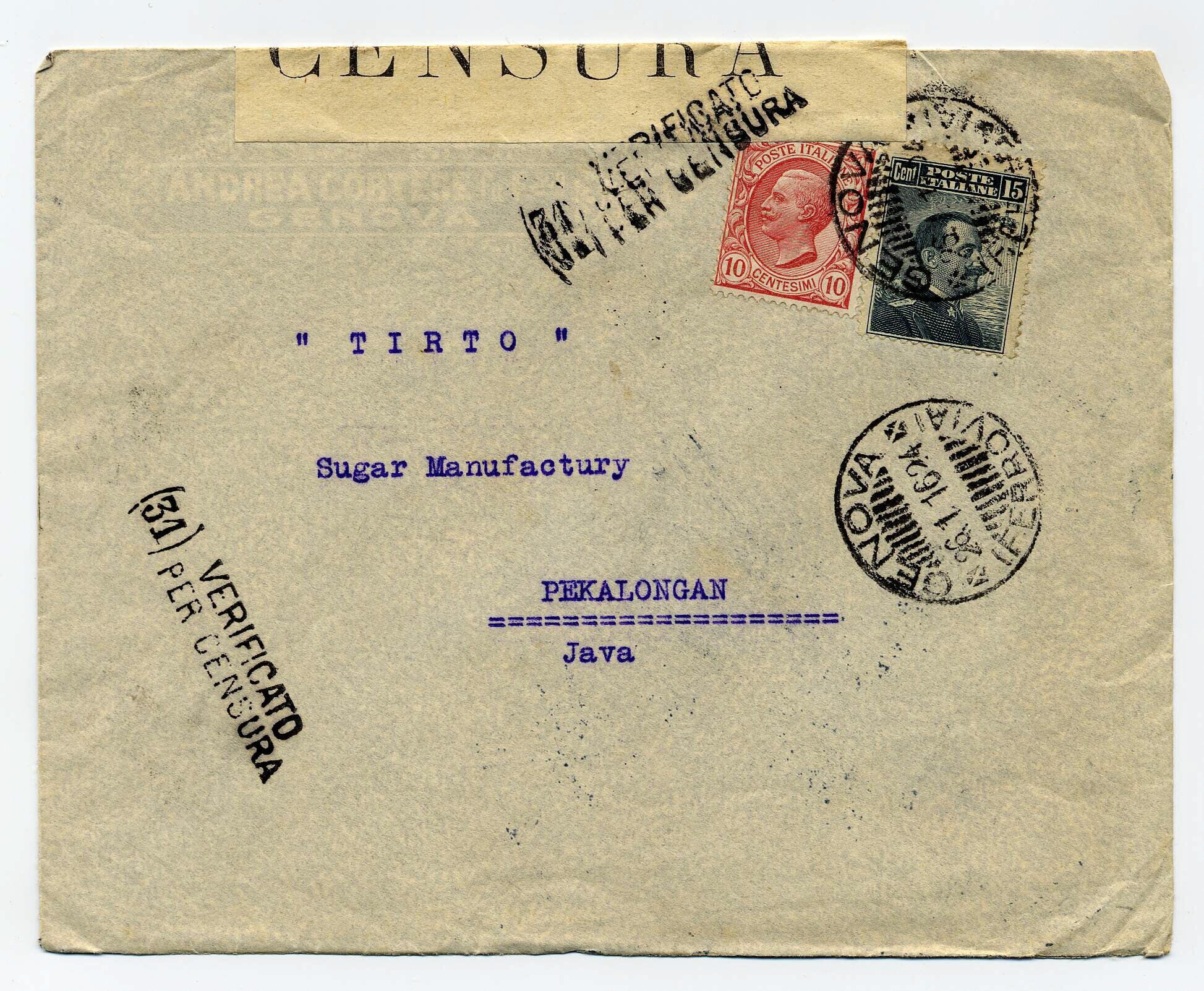 Enveloppe, geadresseerd aan suikerfabriek Tirto in Pekalongan, Java. Met Italiaanse censuurstempel en -zegel.