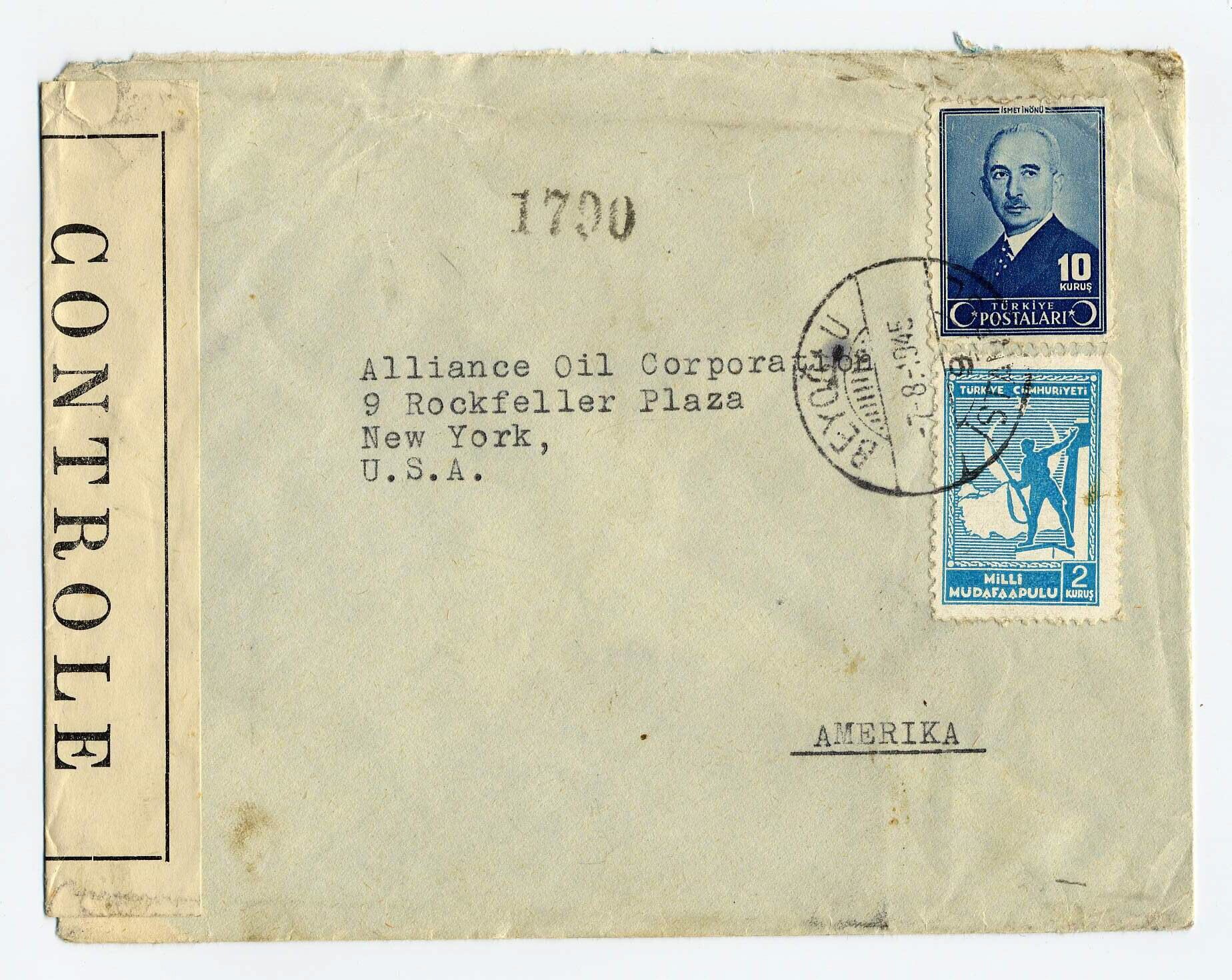 Enveloppe uit Turkije en geadresseerd aan de Alliance Oil Corporation te New York. Met censuurzegel met de tekst: "controle".