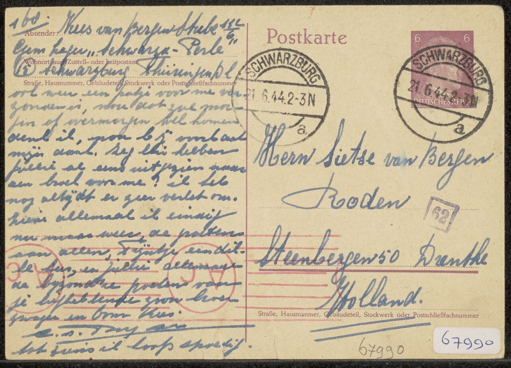 Met pen in het Nederlands geschreven en vanuit Schwarzburg (Duitsland) verzonden briefkaart. De ontvanger is Sietse van Bergen te Roden. Met Duitse censuurstempels.