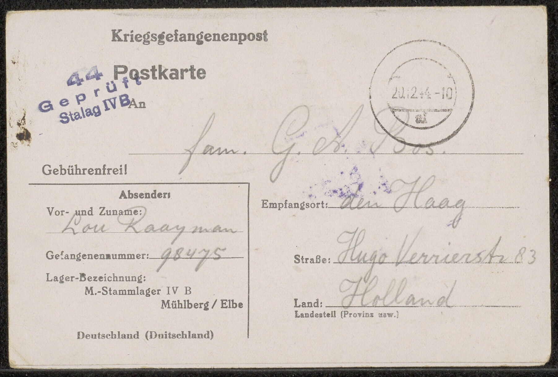 Krijgsgevangenenpost uit Mühlberg: briefkaart van Lou Raayman, M-Stammlager IV, Muehlberg/Elbe, aan de fam. G.A. Bos in Den Haag, gedateerd 10 december 1944. De tekst is met potlood geschreven: "Beste allemaal. In geen 2 mnd iets uit Den Haag of R'dam gehoord. De zaak ligt zeker in duigen he? (...) Hebben de maatregelen van het oppikken van mannen tot 65 jaar jullie ook nog getroffen? Hier alles nog eender, wachten op 't naderende einde. Gezellige Kerstdagen en gelukkig Nieuwjaar." Op de kaart een stempel: "44 geprÂft. stalag IV B".