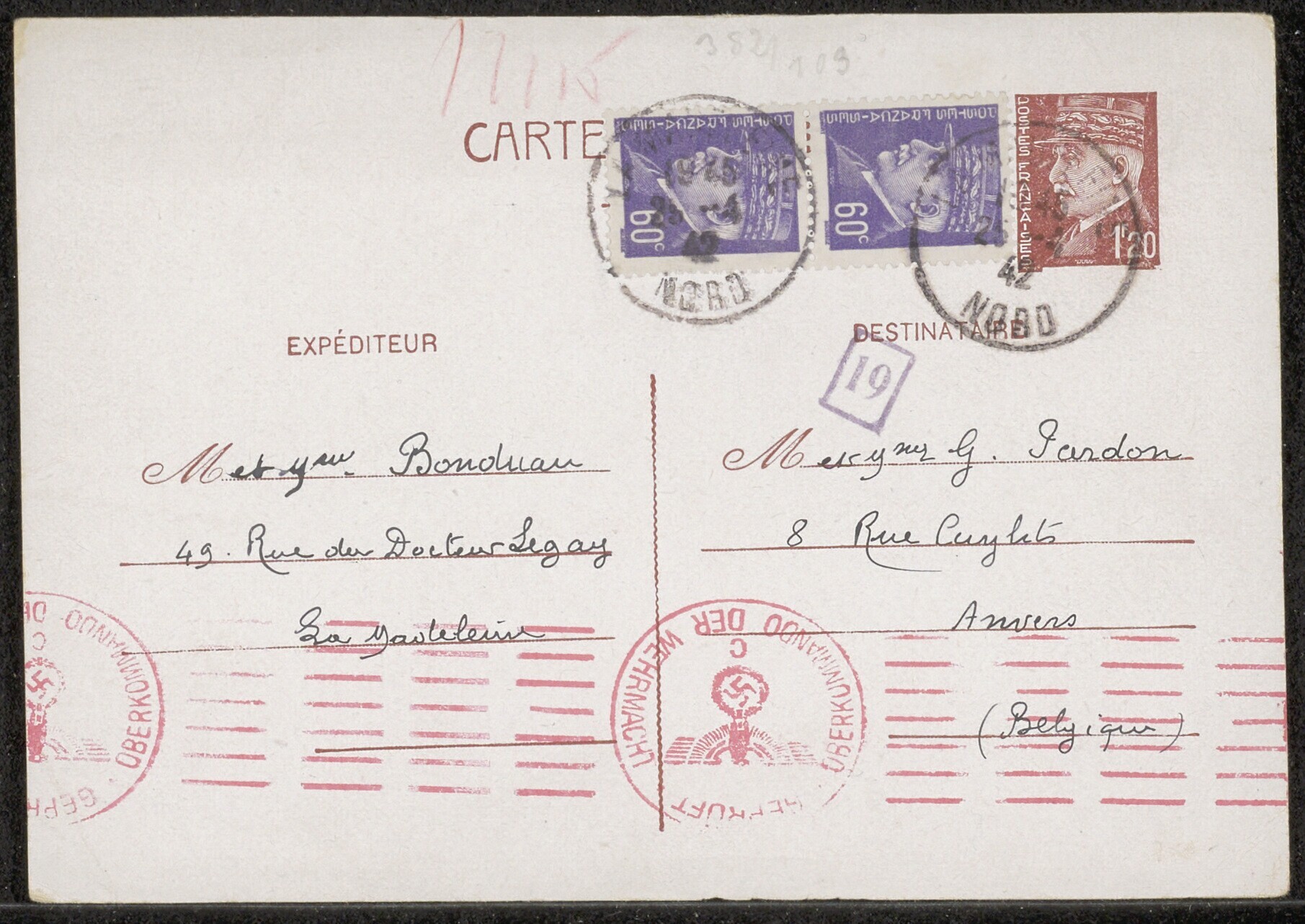 Met pen, in het Frans geschreven briefkaart, gedateerd 26 april 1942 met stempels van de Duitse censuur.