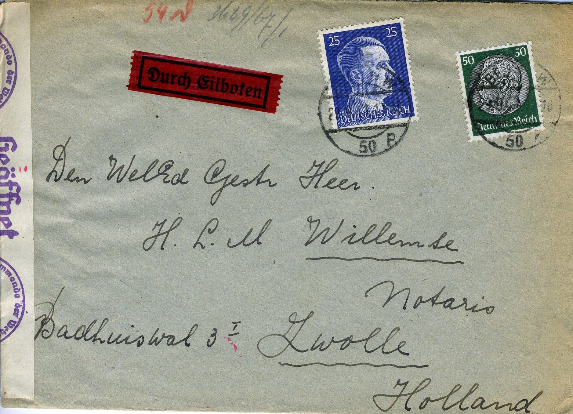 Acht enveloppen met Duitse censuurstempels, zes ervan zijn gericht aan adressen in Nederland, twee aan een adres in België, een in Berlijn.