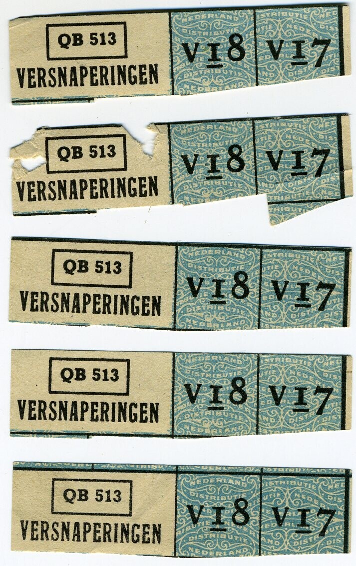 Vijf losse distributiebonnen QB 513, voor het verkrijgen van ''versnaperingen".