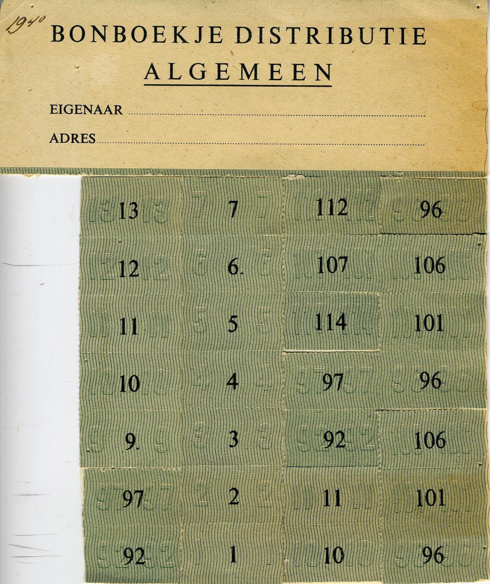 Een bonboekje Distributie Algemeen, twee Bonkaarten Algemeen en drie losse bonnen. Op de achterkant van het bonboekje is met pen geschreven: ''Hierop was van alles verkrijgbaar, rijst, gort, havermout, puddingpoeder, kaas, suiker, vermicelli enz.''