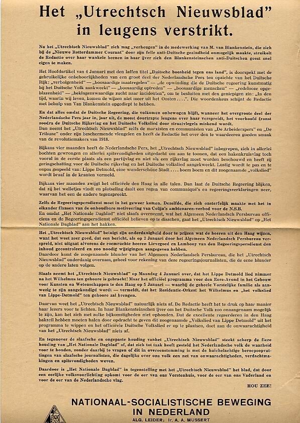 N.S.B.-pamflet tegen anti-Duitse artikelen verschenen in het Utrechts Nieuwsblad.