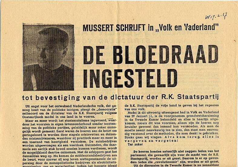 Twee exemplaren van een N.S.B.-pamflet met een overdruk van een artikel van Anton Mussert uit Volk en Vaderland.
