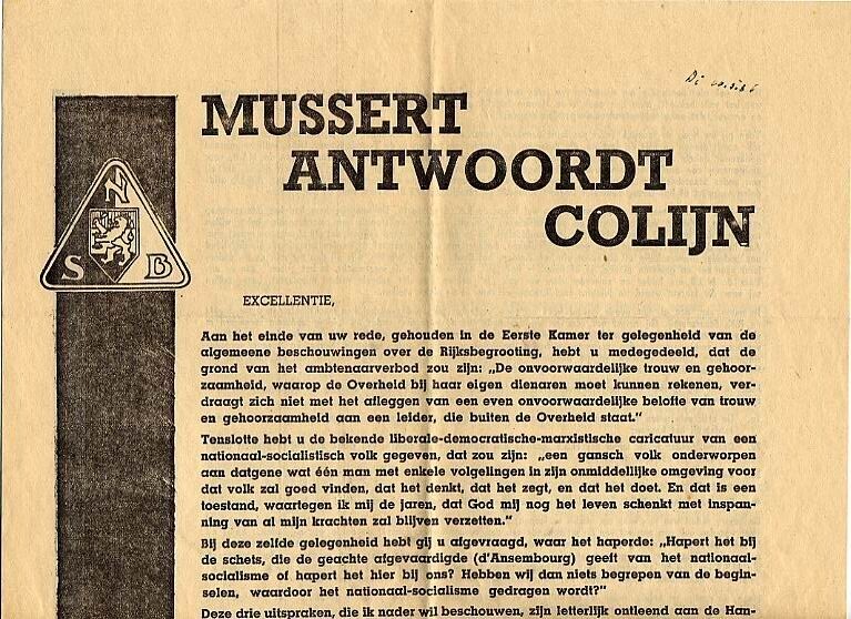 Tweezijdig bedrukt vel met een betoog in de vorm van een open brief van de hand van Anton Mussert tegen anti-N.S.B.-maatregelen van de regering-Colijn.