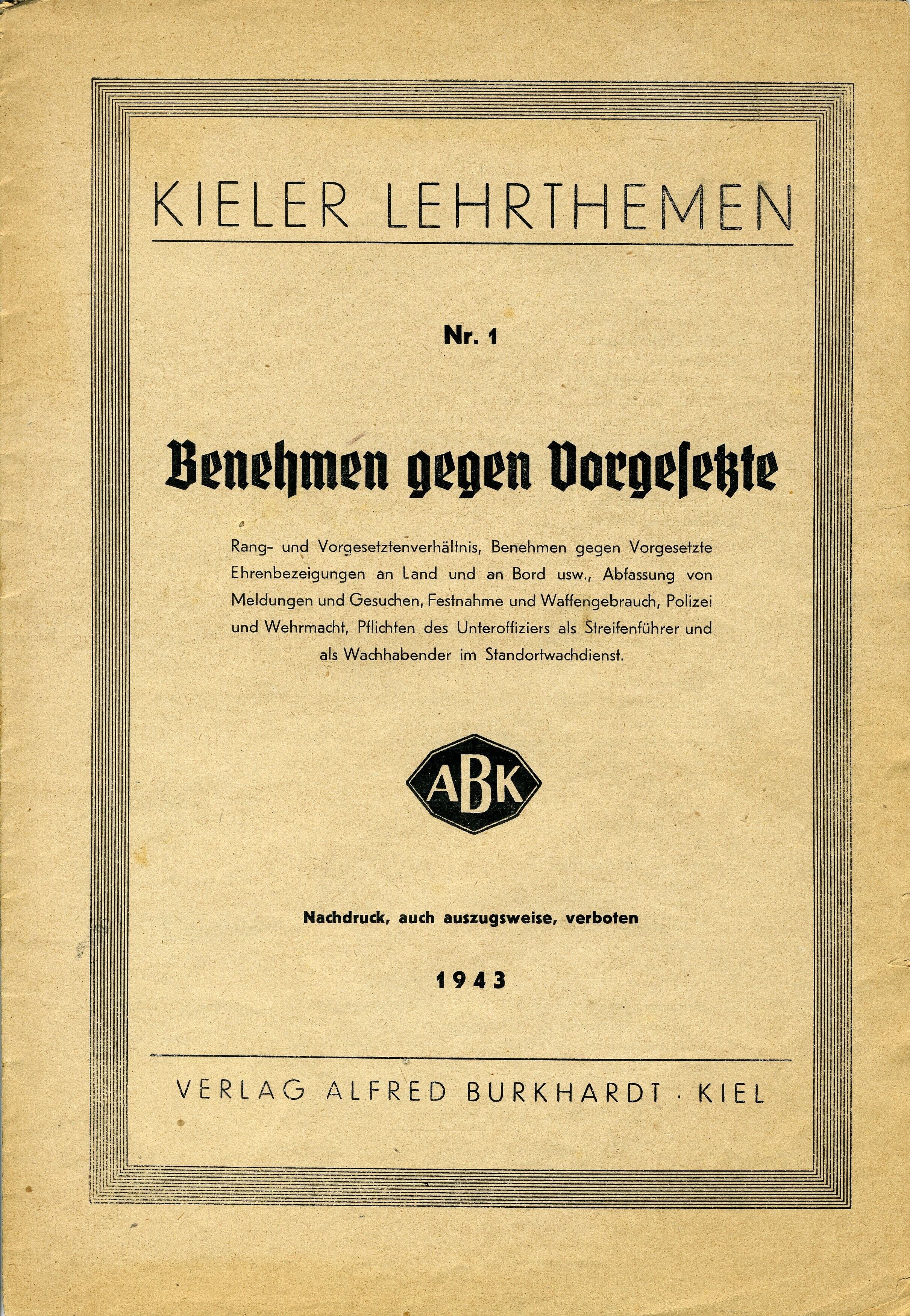 Vier Duitse militaire voorschriften van de "Kieler Lehrthemen" voor marine, luchtmacht en krijgsmacht. De boeks gaan ondermeer over hoe er gegroet moet worden. <br>Achtergelaten in kazerne Steenwijk.<br>Nr. 1 Benehmen gegen Vorgesetzte. (16 pagina's)<br>Nr. 2 Uniform und Rangabzeichen. (16 pagina's)<br>Nr. 3 Schiesz-Ausbildung. (24 pagina's)<br>Nr. 4 Geschichte der Deutschen Kriegsmarine. (16 pagina's)