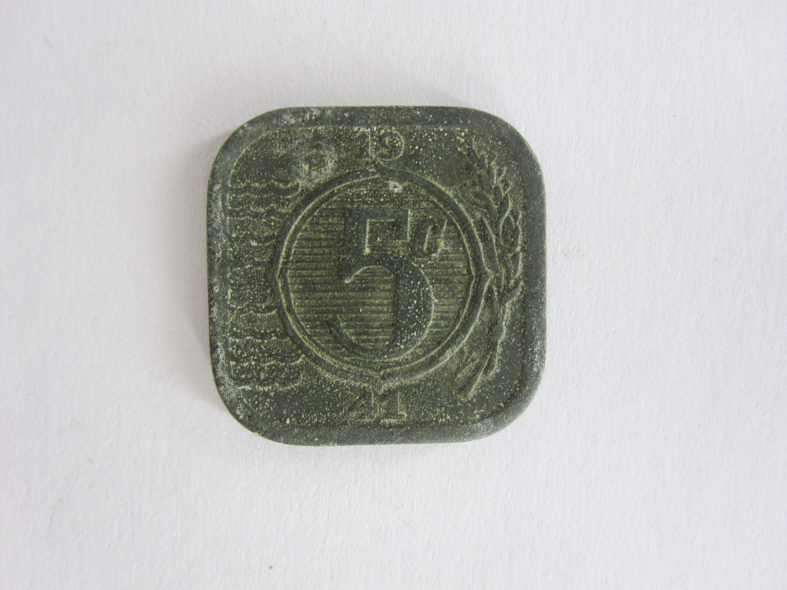 Een zinken Nederlandse vierkante munt met afgeronde hoeken van vijf cent uit 1941. Op de voorzijde de denominatie "5c" in en rond kader met links golvend water en rechts korenaren. Boven het kader: "19" en onderaan: "41". Munteken: Mercuriusstaf (Utrecht) onder de korenaren. Op de keerzijde: twee Saksische paardenhoofden onder een stralende zon in en vierkant kader met daaronder: "Nederland".