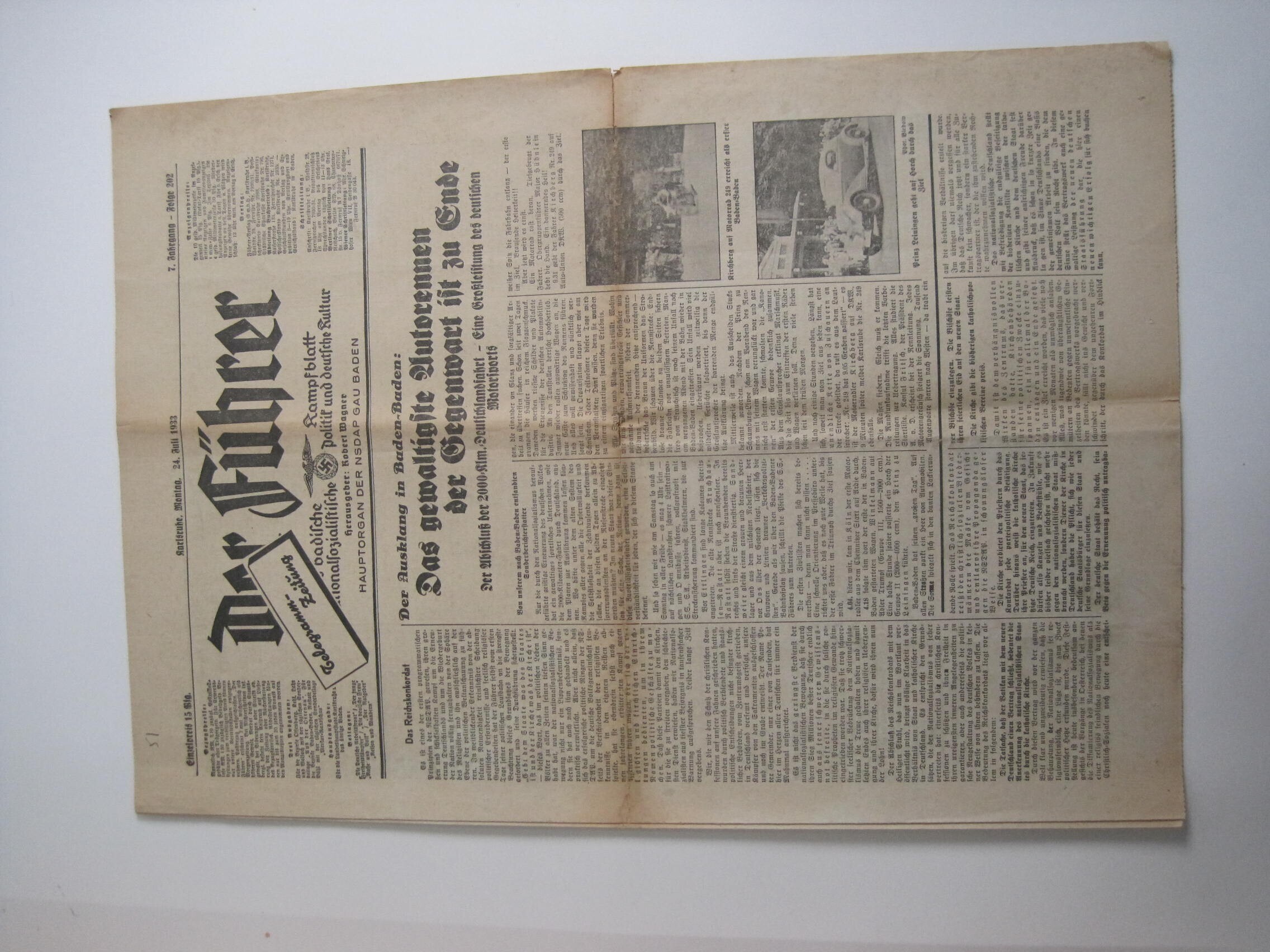 Een uitgave van "Der FüÂhrer. Das badische Kampfblatt für nationalsozialistische Politik und deutsche Kultur. Hauptorgan der NSDAP Gau Baden", zevende jaargang, nummer 202 van 24 juli 1933.