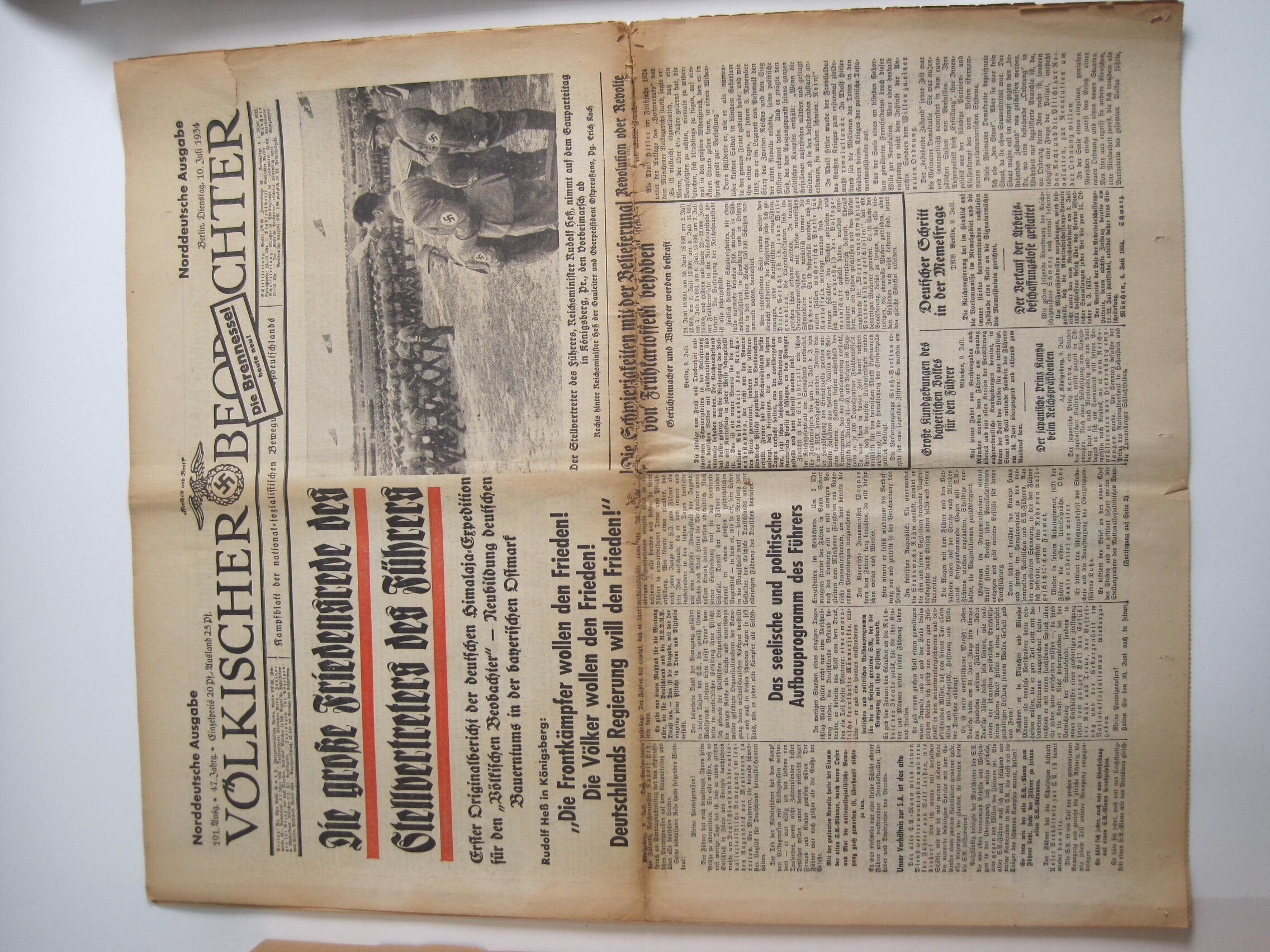 Een uitgave van de "Volkischer Beobachter, Kampfblatt der national-sozialistischen Bewegung Grossdeutschlands" jaargang 1934, "Norddeutsche Ausgabe" van 10 juli 1934.