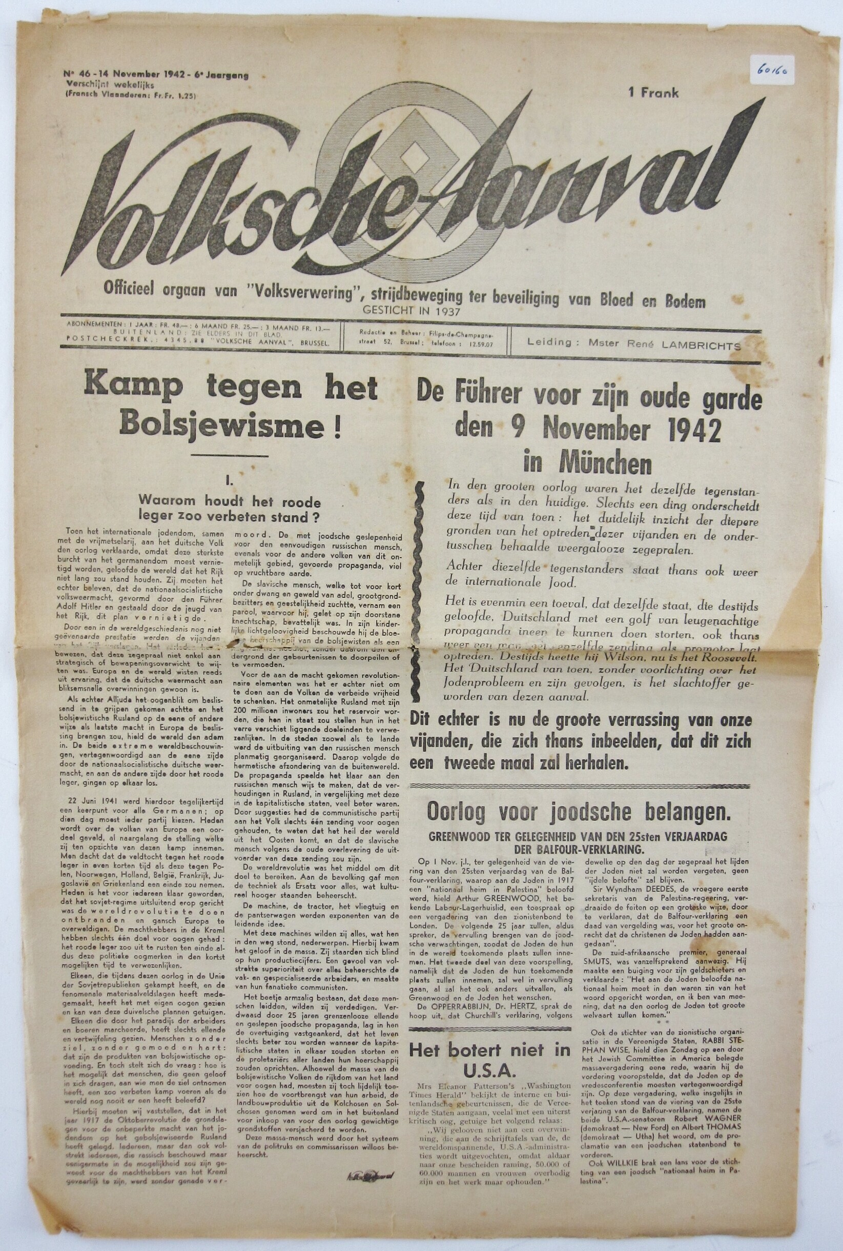 Exemplaar van het Belgische weekblad 'Volksche Aanval'. Het officieel orgaan van "Voksverwering", strijdbeweging ter beveiliging van Bloed en Boden. Zesde jaargang nummer 46 van 14 november 1942. In dit exemplaar een aantal antisemitische artikelen en spotprenten.