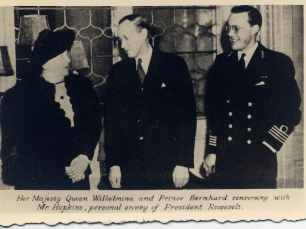 Her Majesty Queen Wilhelmina and Prince Bernard conversing with Mr. Hopkins, personal envoy of President Roosevelt