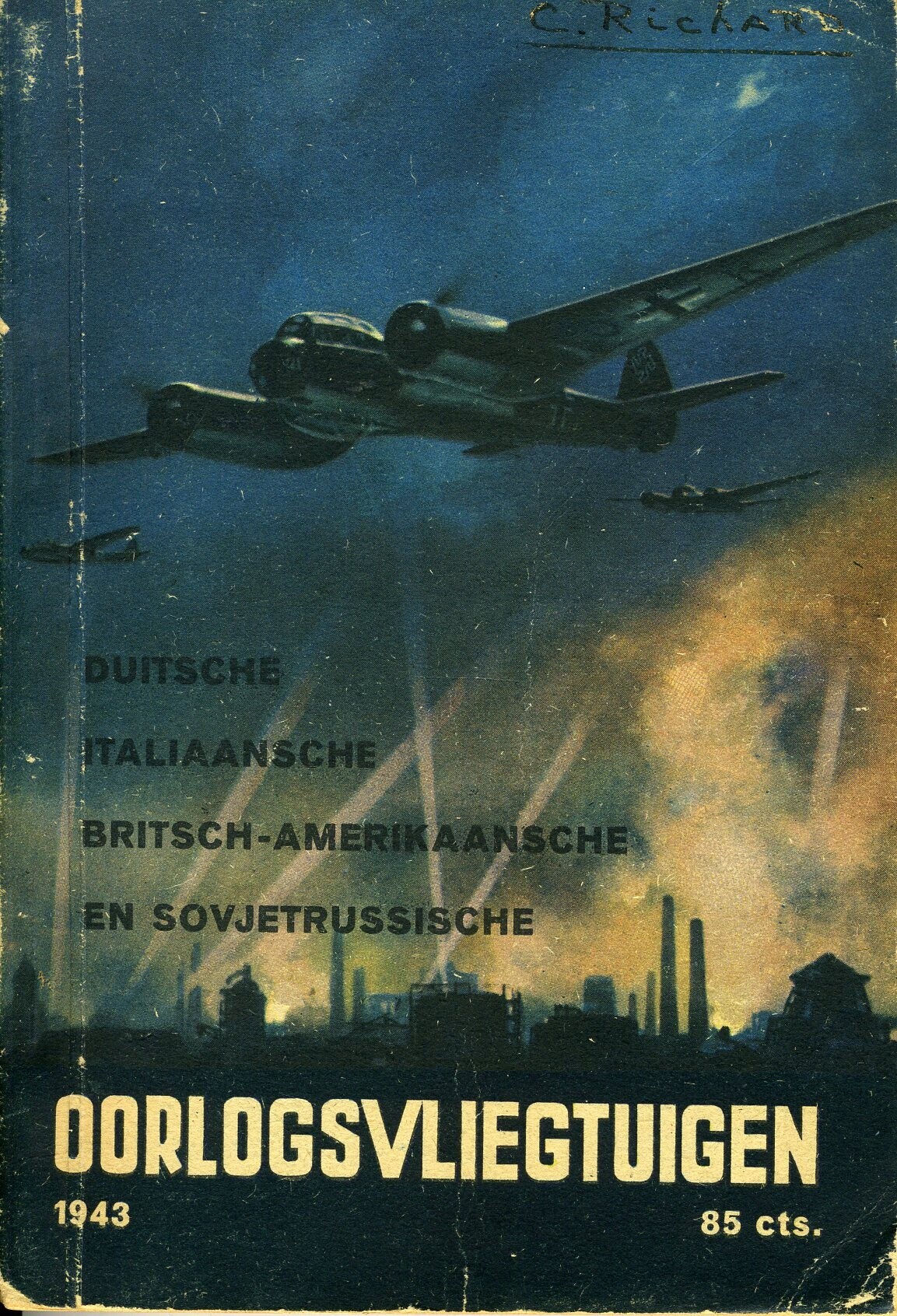 Twee exemplaren van "Oorlogsvliegtuigen" waarin Duitse, Italiaanse, Brits-Amerikaanse en Sovjet-Russische vliegtuigen worden beschreven. Op de omslag een afbeelding van over een industrielandschap met zoeklichten vliegende bommenwerpers. Het boek omvat 163 pagina's en is geïllustreerd met zwartwit foto's en tekeningen.