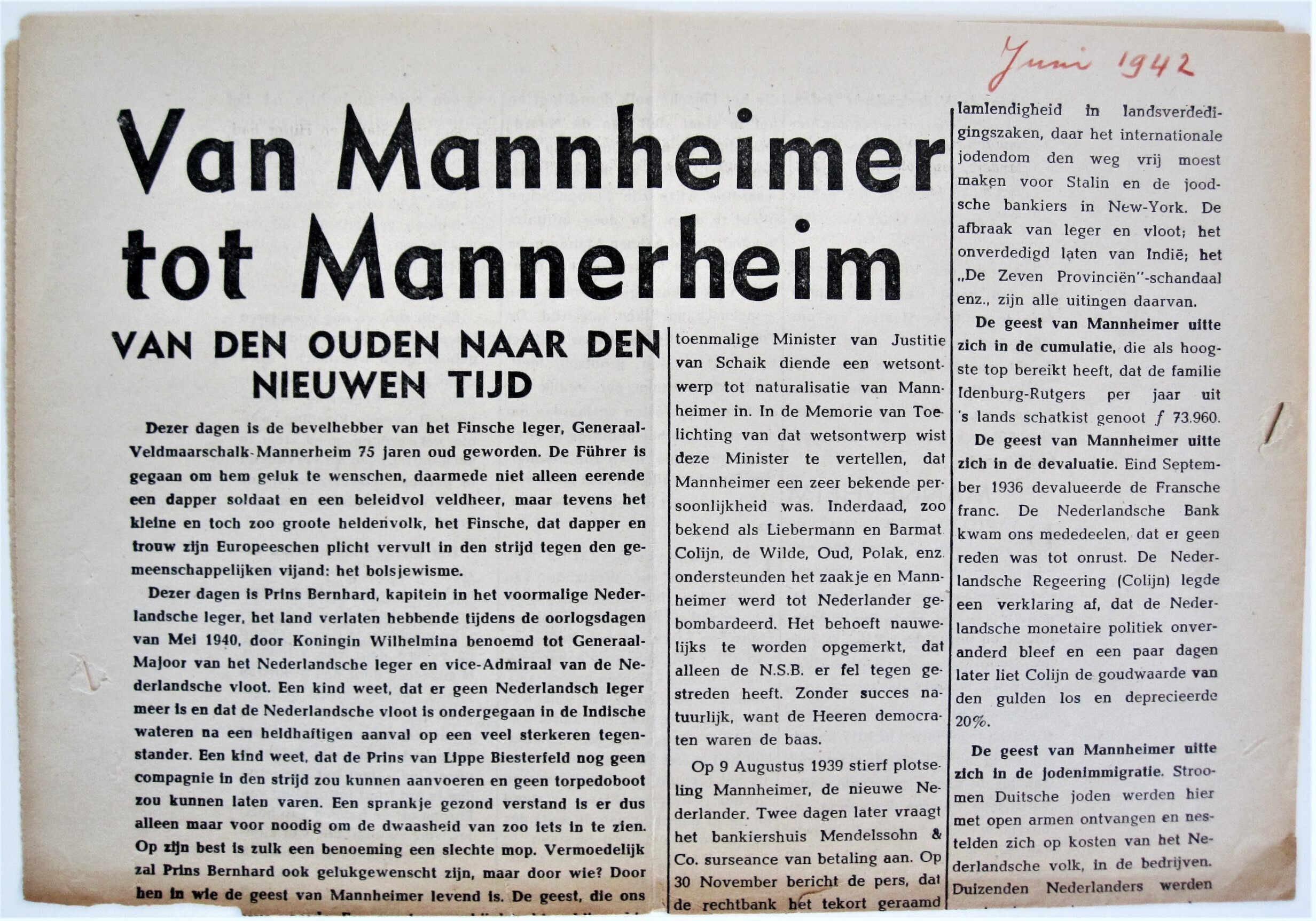 Twee exemplaren van een overdruk uit Volk en Vaderland van 19 juni 1941 over de Finse generaal-veldmaarschalk Mannerheim en de Duits-Nederlandse bankier Fritz Mannheimer.