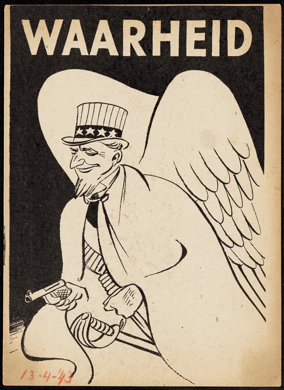 Geïllustreerde boek over 'De aanvalsoorlogen van het Anglo-Amerikaansche imperialisme' met daarin een opsomming van 24 oorlogen en revoluties waarbij de Verenigde Staten tussen 1846 en 1941 betrokken zijn geweest, van de oorlog onder president Polk tegen Mexico in 1846/48 tot en met de revolutie die in 1941 door de Verenigde Staten in Panama is aangesticht. Op het omslag een tekening van Uncle Sam met engelenvleugels op de rug, een revolver in de ene, een dolk in de andere hand en een zwaard om zijn middel.