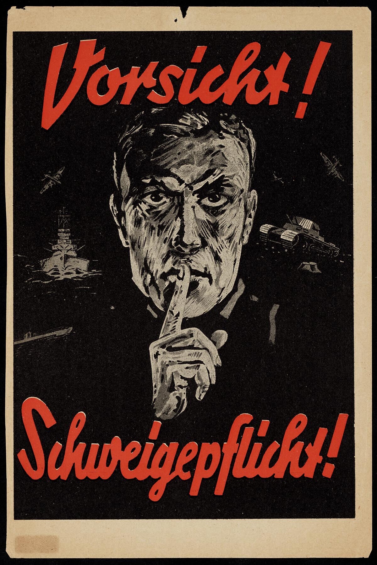 In zwartwit uitgevoerd affiche met rode letters: "Vorsicht! Schweigepflicht!". In het midden een man die een vinger voor zijn mond houdt. Links naast hem een vliegtuig, oorlogsbodem en onderzeeër, rechts een tank en een vliegtuig.