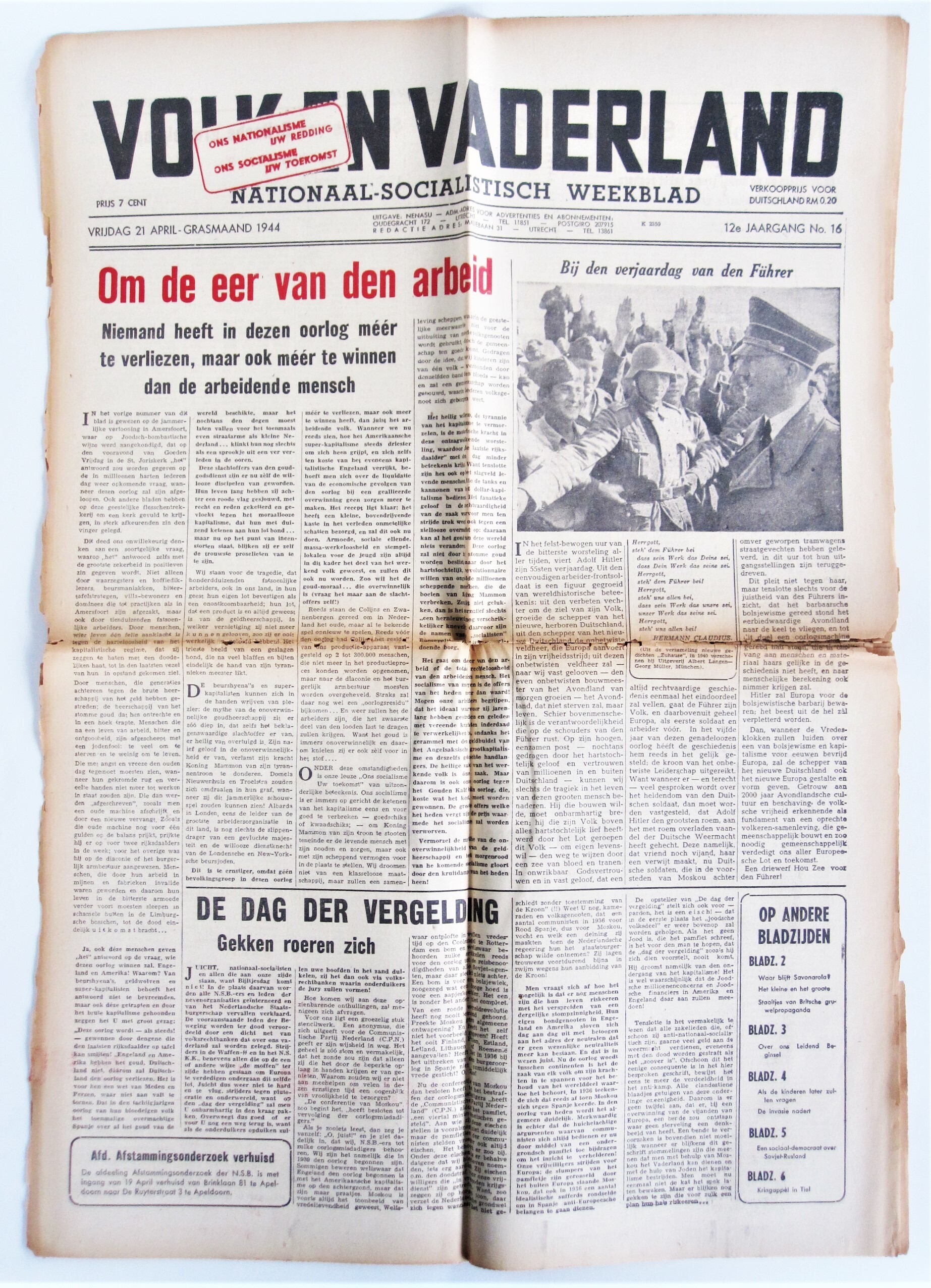 Jaargang twaalf van 'Volk en Vaderland', nationaalsocialistisch weekblad van de N.S.B. Het betreft 36 exemplaren van dit weekblad uit de periode 7 januari - 15 december 1944.